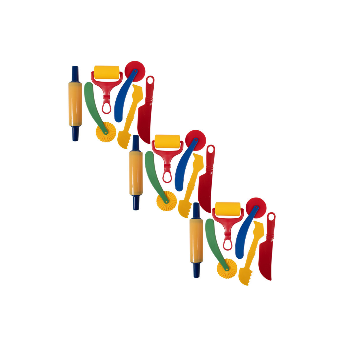 6 DIFFERENT TOOLS -- Each set of dough and clay tools includes a rolling pin, roller with handle, patterning modeling wheel, straight modelling wheel, dough knife and spatula. Sold as 3 sets for a total of 18 dough tools!