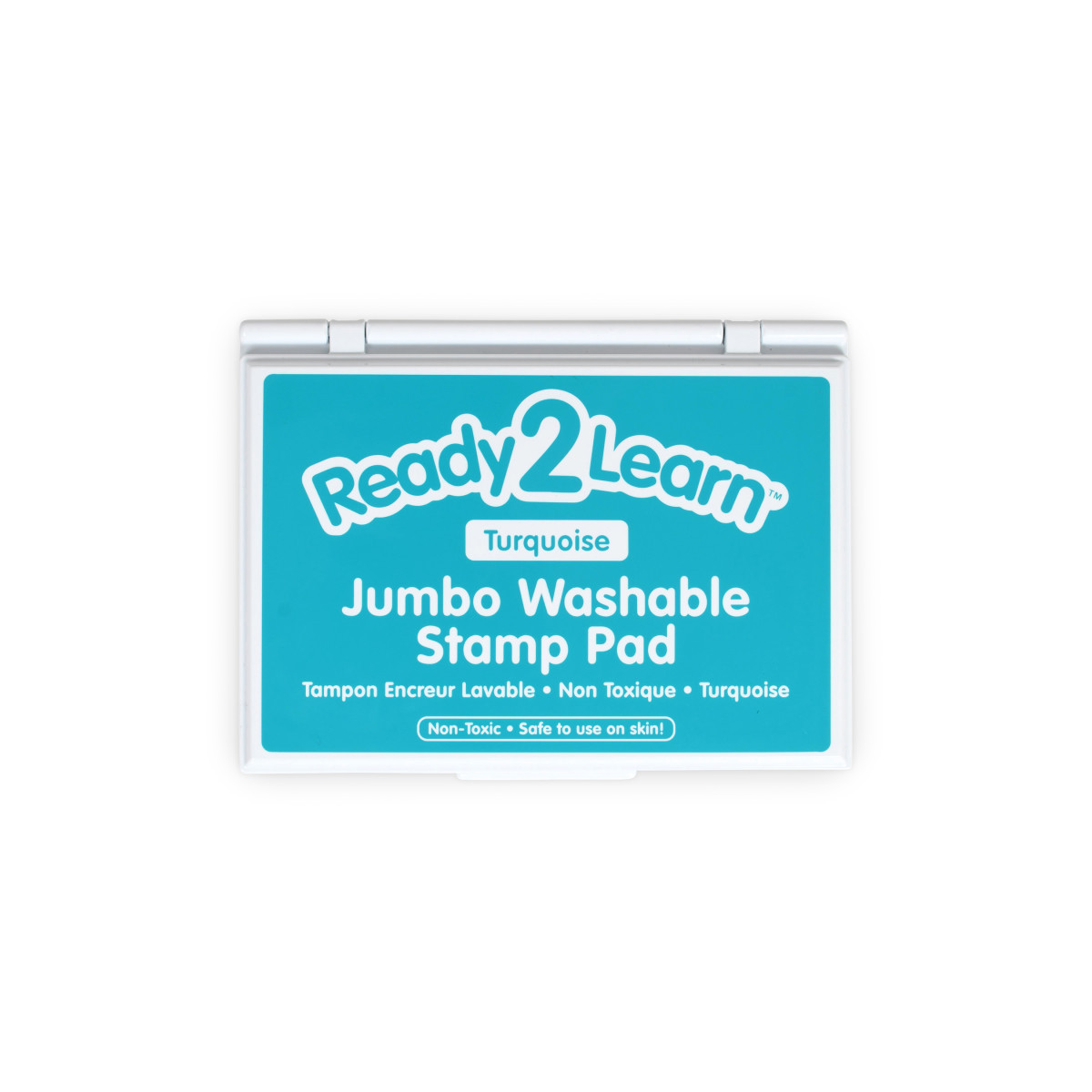 This large turquoise stamp pad contains washable, non-toxic ink. Washable stamp pads offer a variety of creative possibilities with easy cleanup! The ink is safe for hand and finger stamping and washes off skin and most clothing with warm, soapy water. The quick-drying, fade-resistant ink is also acid-free for archival quality. The raised pad means there are no hard edges around the ink. Children can press down without hitting an edge, which provides more area for stamping. The turquoise ink in this stamp pad presents crisp, vivid images when stamped. Stamping is a fun way to develop fine motor skills and foster creative expression. The ink pad is packaged in a plastic case with a flip cover to prevent it from drying out. For ages 3+. Size of ink pad: 6.2"L x 4.1"W. Size of entire stamp pad (with plastic casing): 6.7"L x 4.9"W x 0.75"H.
