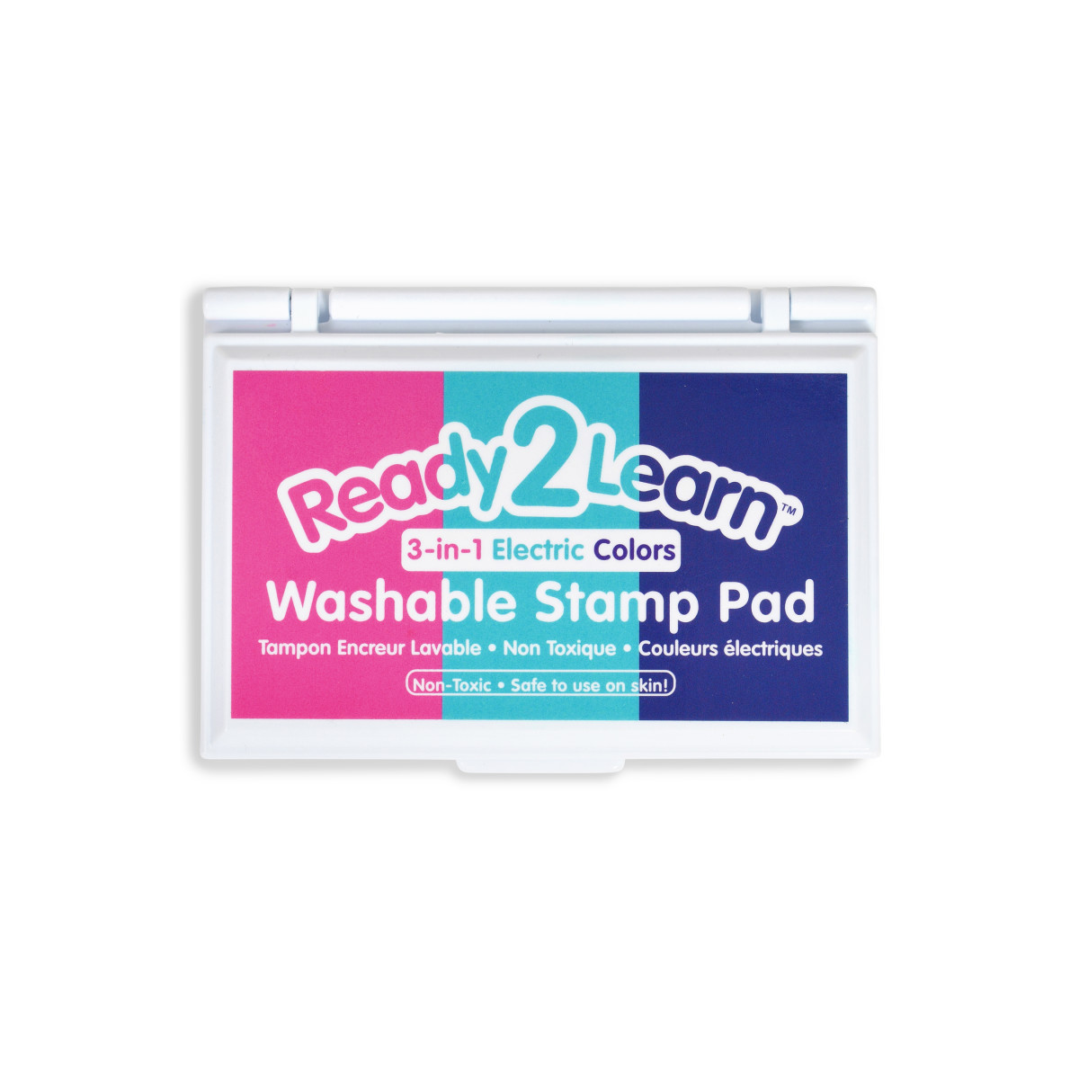 Stamp and create with this electric Washable 3-in-1 Stamp Pad! This stamp pad features sections of pink, purple and turquoise ink. Made of non-toxic ink, this stamp pad is safe for ages 3+. The ink is acid-free and fade-resistant for archival quality, which means you can store your little artist's creations forever! The raised pad means there are no hard edges around the ink. Children can press down without hitting an edge, which provides more area for stamping. An open-ended tool to decorate scrapbooks, notebooks or cards, this stamp pad inspires creative expression and imagination. As children stamp, they will develop fine motor skills and hand-eye coordination. The ink will wash off skin with soap and water. || Size of ink pad surface area: 3.5"L x 2.1"W.
