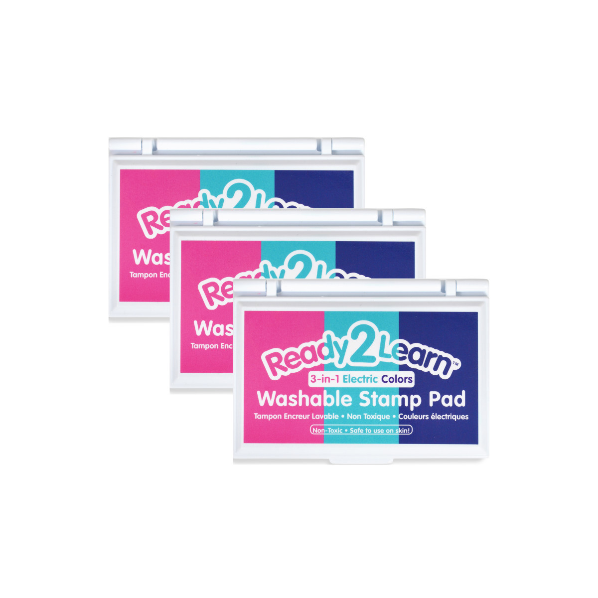Stamp and create with this electric Washable 3-in-1 Stamp Pad! This stamp pad features sections of pink, purple and turquoise ink. Made of non-toxic ink, this stamp pad is safe for ages 3+. The ink is acid-free and fade-resistant for archival quality, which means you can store your little artist's creations forever! The raised pad means there are no hard edges around the ink. Children can press down without hitting an edge, which provides more area for stamping. An open-ended tool to decorate scrapbooks, notebooks or cards, this stamp pad inspires creative expression and imagination. As children stamp, they will develop fine motor skills and hand-eye coordination. The ink will wash off skin with soap and water. Size of ink pad surface area: 3.5"L x 2.1"W. Sold as a pack of 3 stamp pads.