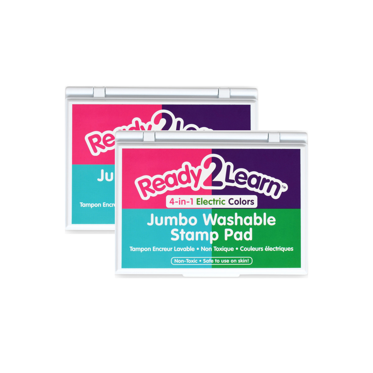 This large stamp pad contains pink, purple, turquoise and green ink pads within one case. Washable stamp pads offer a variety of creative possibilities with easy cleanup! The ink washes off fingers and most clothing with warm, soapy water. The quick-drying, fade-resistant ink is also acid-free for archival quality. The raised pad means there are no hard edges around the ink. Children can press down without hitting an edge, which provides more area for stamping. This electric stamp pad presents crisp, vivid images when stamped. Stamping is a fun way to develop fine motor skills and foster creative expression. The ink pads are packaged in a plastic case with a flip cover to prevent them from drying out. For ages 3+. Size of each color: 3.2"L x 2"W. Size of entire stamp pad (with plastic casing): 6.7"L x 4.9"W x 0.75"H. Sold as a pack of 2 stamp pads.