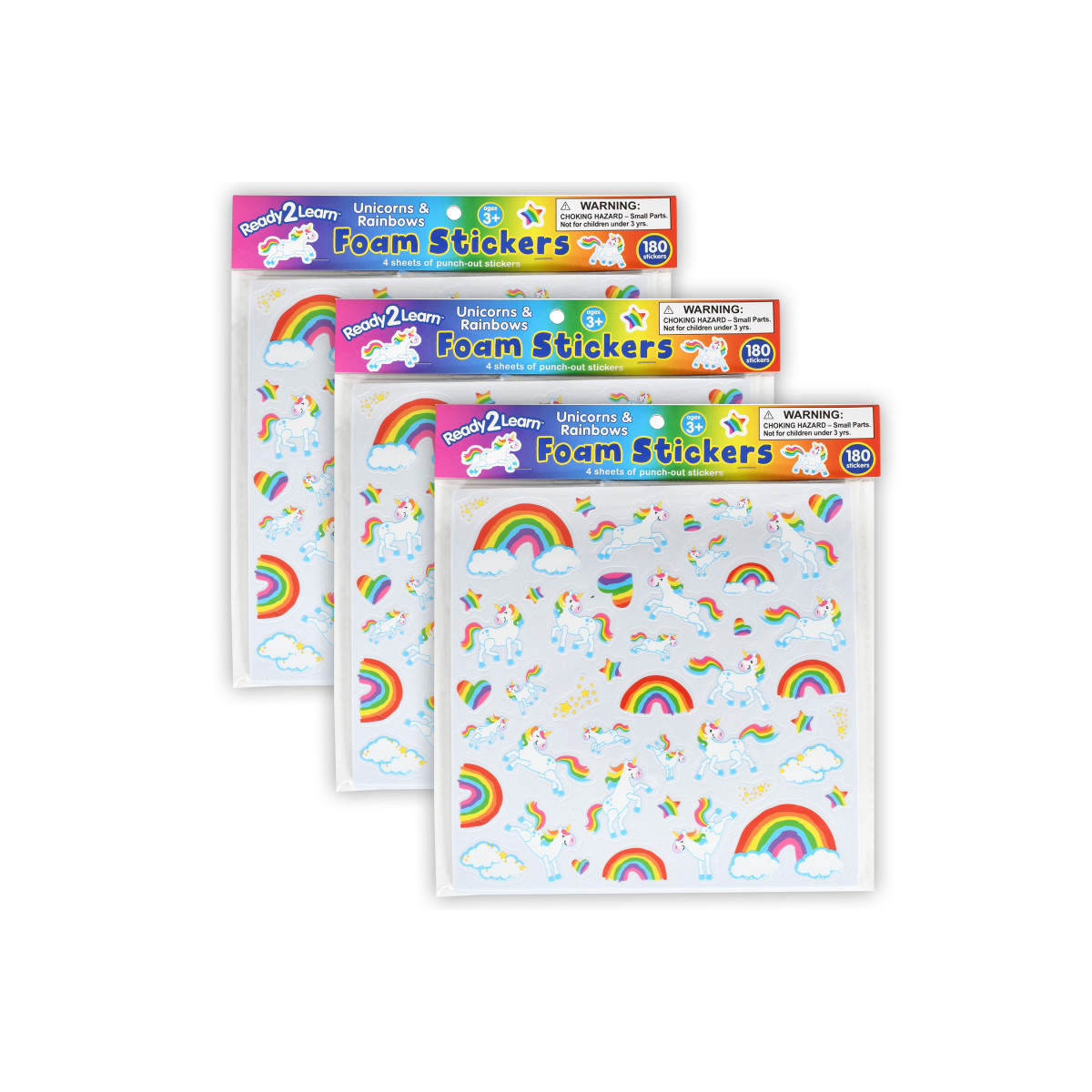 UNICORN AND RAINBOW STICKERS -- Sold as 3 packs, each imaginative sticker pack includes 4 foam sheets, each with 45 punch-out stickers in 18 different images. Decorate with unicorns, rainbows, clouds and stars!