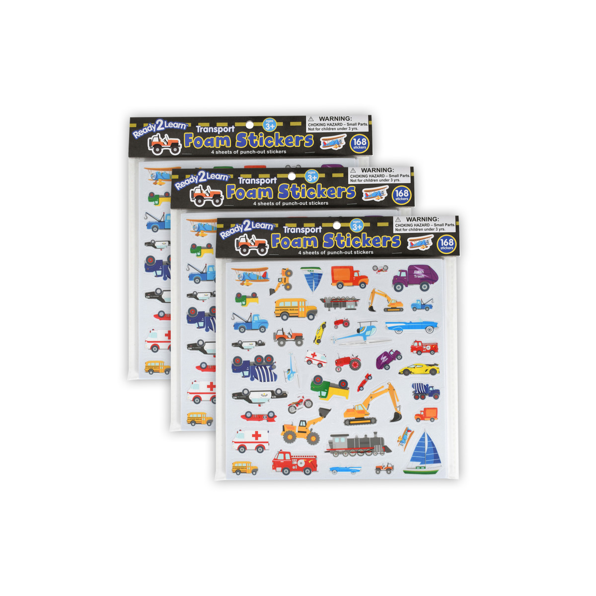 TRANSPORT STICKERS -- Sold as 3 packs, each transport sticker pack includes 4 foam sheets, each with 42 punch-out stickers in 21 different images. Decorate with land, air and sea vehicles!