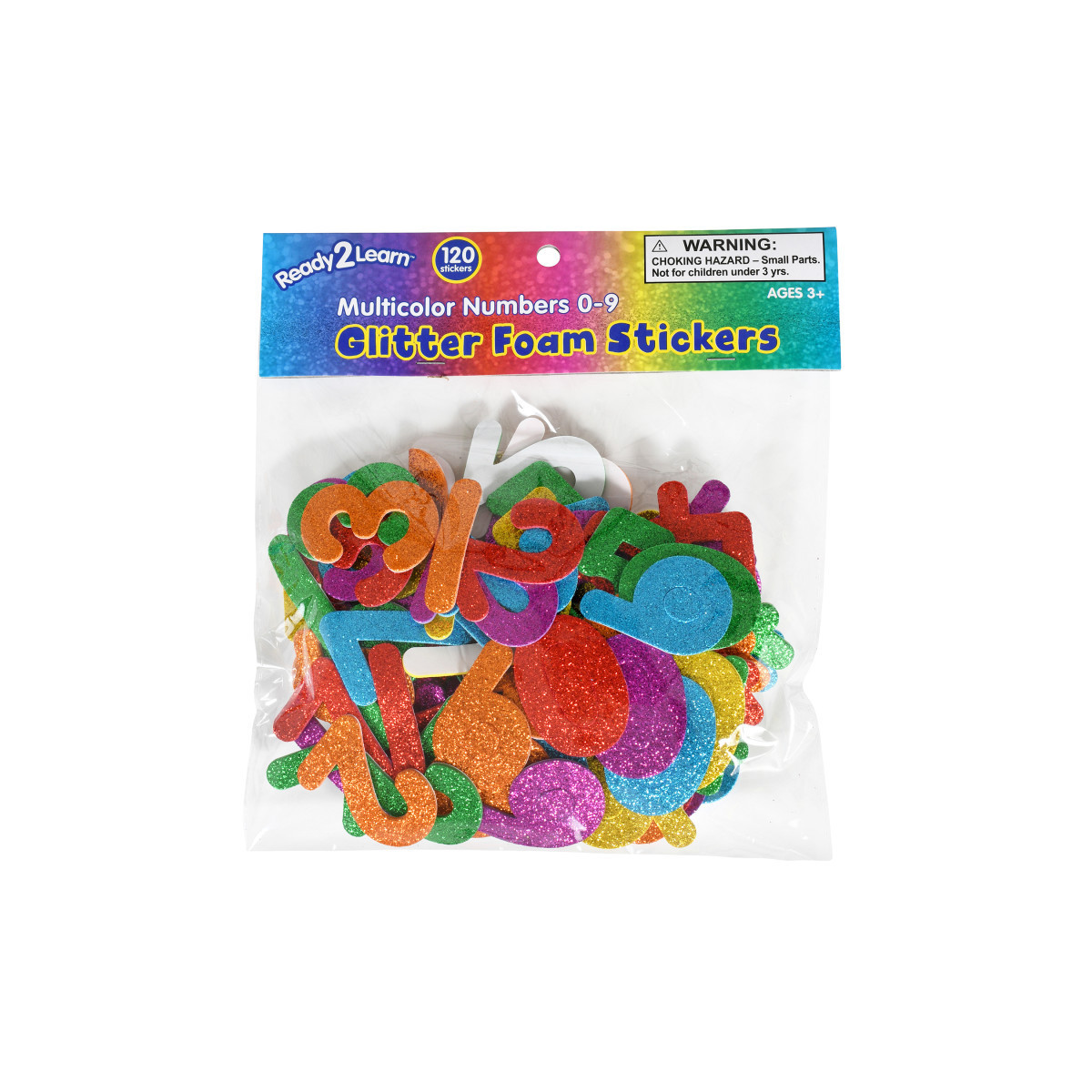 Create sparkly scenes and personalize your stuff with foam number stickers! This sticker pack includes 120 stickers with 12 each of numbers 0-9. Colors include orange, red, yellow, green, blue and purple. These mess-free stickers don't require glue and are easy for children to peel and stick. Number stickers are a hands-on, visual tool to practice number recognition and counting. Children can also practice early addition and subtraction. Use these glitter stickers to personalize greeting cards, posters, notebooks and more! Crafting with stickers contributes to the development of children's fine motor skills, hand-eye coordination and creative expression. These thick EVA foam stickers are easy to hold and manipulate. The stickers are non-toxic. For ages 3+. Largest size: 1.6"L x 1.5"W.