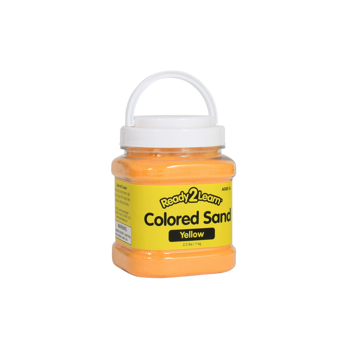 This jar contains 2.2 lbs of decorative golden yellow sand. Colored sand is a versatile addition to any crafting supply collection or sensory bin. Adhere sand to 2D art projects for color and texture. Create layered 3D sand art in jars, bottles, glasses, flower vases, shadowboxes and more. Or, incorporate sand into a variety of sensory stations and activities. Crafting with sand contributes to the development of children's fine motor skills, hand-eye coordination and creative expression. The jar features a lid and a handle for easy cleanup, storage and travel. This sand is non-toxic. For ages 3+. Size of jar: 3.25"L x 3.5"W x 5"H.