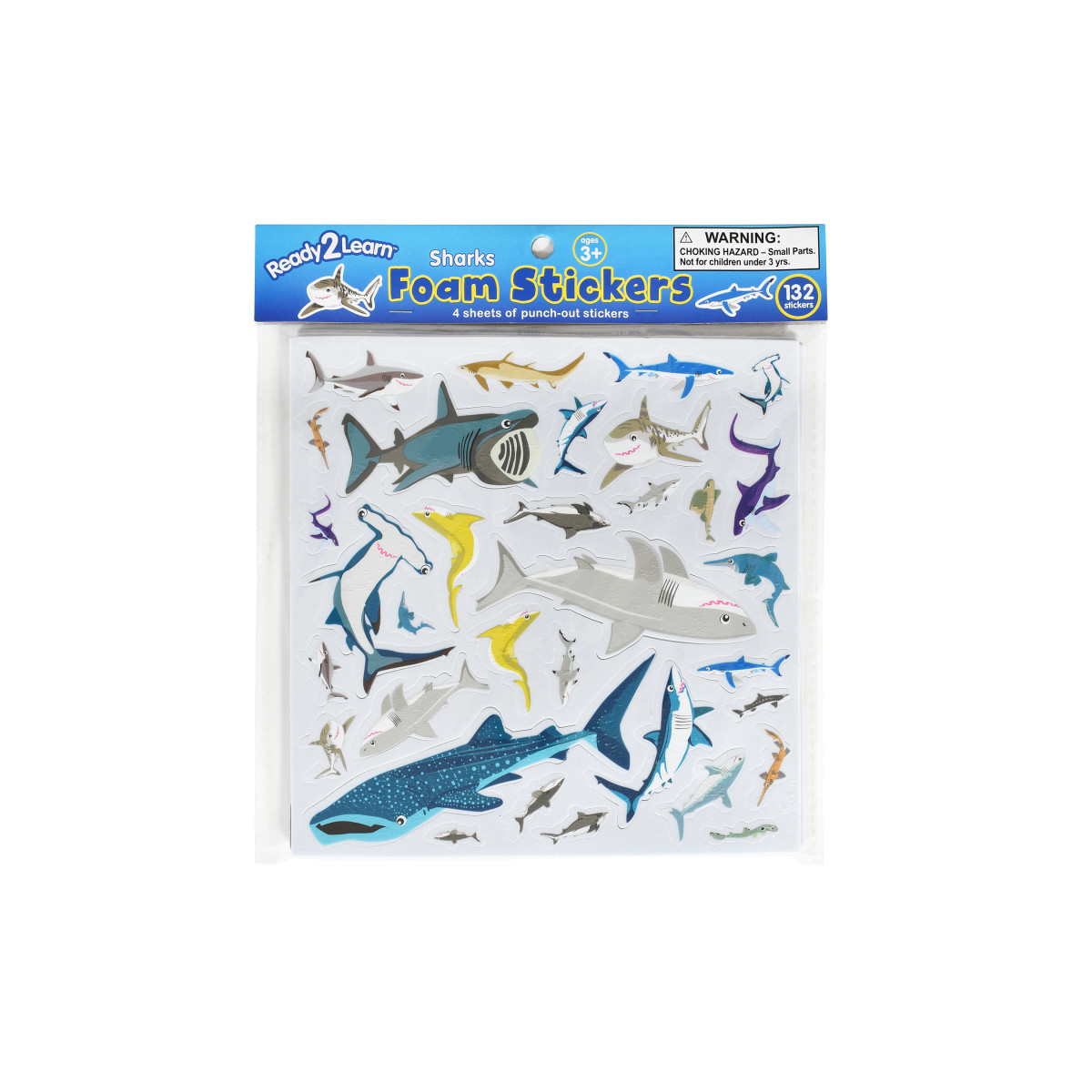 - 132 SHARK STICKERS -- This shark-themed sticker pack includes 4 foam sheets, each with 33 punch-out stickers in 20 different images. Decorate with great white sharks, tiger sharks and more!