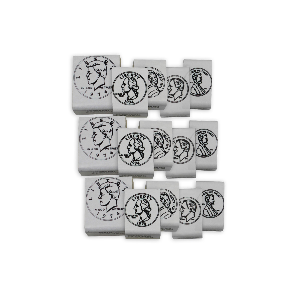 - COIN STAMPS -- Sold as 3 sets, each set includes 5 wooden stamps with detailed rubber imprints of the heads side of the penny, nickel, dime, quarter and half dollar.