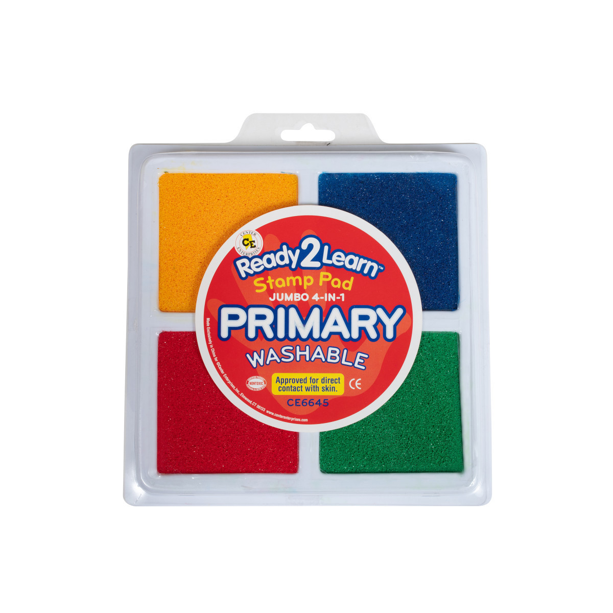 Stamp and create with this Jumbo 4-in-1 Washable Stamp Pad! This stamp pad includes 4 separate ink pads of red, yellow, green and blue ink. Made of non-toxic ink, this stamp pad is safe for ages 3+. The ink is acid-free and fade resistant for archival quality, which means you can store your little artist's creations forever! An open-ended tool to decorate scrapbooks, notebooks or cards, this stamp pad inspires creative expression and imagination. As children stamp, they will develop fine motor skills and hand-eye coordination. The ink will wash off skin with soap and water. Size of each color: 2.9"L x 2.9"W.