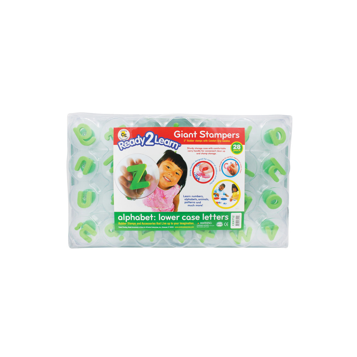 Create literacy lessons and decorate DIY projects with these Giant Lowercase Alphabet Stampers! This 28-piece set includes 28 different alphabet-themed stamps: lowercase letters a-z, ñ and a question mark. Each stamp features a large foam shape mounted on a 3" disc for stability. The chunky, rounded handles provide greater comfort and control. Ideal for DIY projects and art and craft time, these giant stampers assist in developing fine motor skills and creativity. Size: 1.9"H x 3" dia.