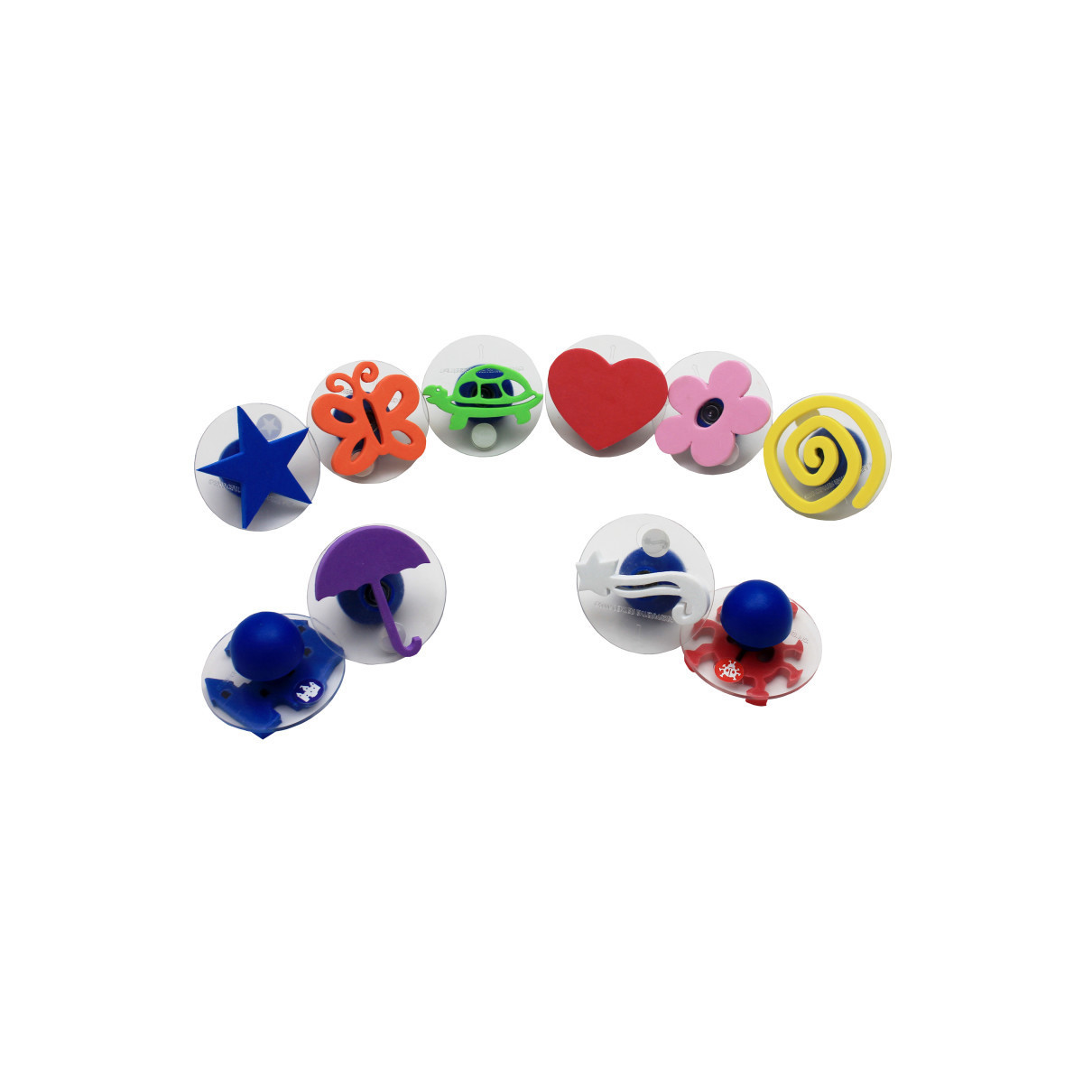 Imagine and decorate DIY projects with these Giant Imaginative Play Stampers! This 10-piece set includes 10 different creative stamps: a heart, castle, turtle, star swirl, flower, butterfly, curl, ladybug, star and umbrella. Each stamp features a large foam shape mounted on a 3" disc for stability. The chunky, rounded handles provide greater comfort and control. Ideal for DIY projects and art and craft time, these giant stampers assist in developing fine motor skills and creativity. Size: 1.9"H x 3" dia.