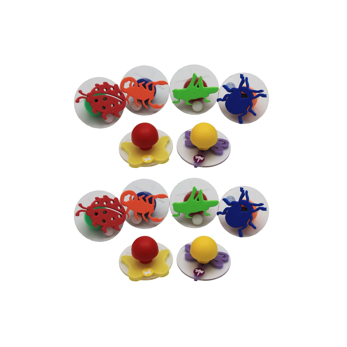 Create scenes and decorate DIY projects with these Giant Insect Stampers! Each 6-piece set includes 6 different bug-themed stamps: beetle, dragonfly, ladybug, scorpion, grasshopper and butterfly. Each stamp features a large foam shape mounted on a 3" disc for stability. The chunky, rounded handles provide greater comfort and control. Ideal for DIY projects and art and craft time, these giant stampers assist in developing fine motor skills and creativity. Size: 1.9"H x 3" dia. Each pack includes 6 stamps. Sold as 2 packs for 12 stamps total.
