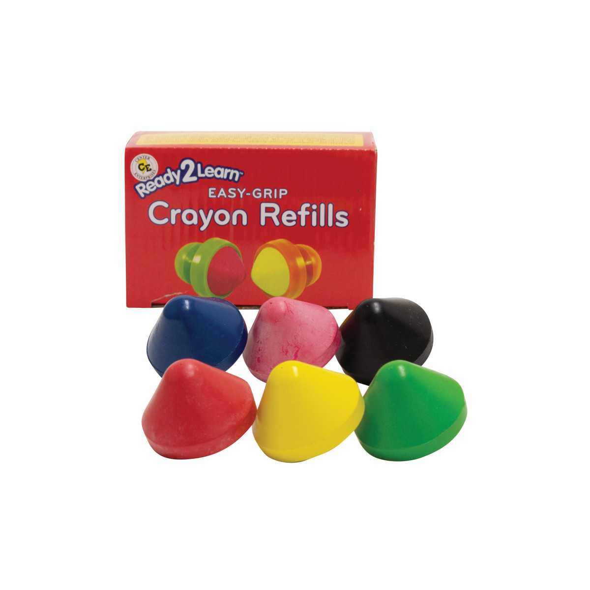 This set includes 6 crayon refills for Easy Grip Crayons (CE6911) in red, green, blue, yellow, pink and black. Easy Grip Crayons feature ball-shaped, plastic handles and rest comfortably in small hands. Perfect for special needs children, these crayons provide greater fine motor control as children create, craft and color. With 6 bright colors and an ergonomic design, Easy Grip Crayons also foster independence and inspire creative expression. No more worrying about snapping crayons! These crayon refills easily screw into the easy grip handles. Includes instructions. For ages 18m+. Size of refills: 1.5" dia.