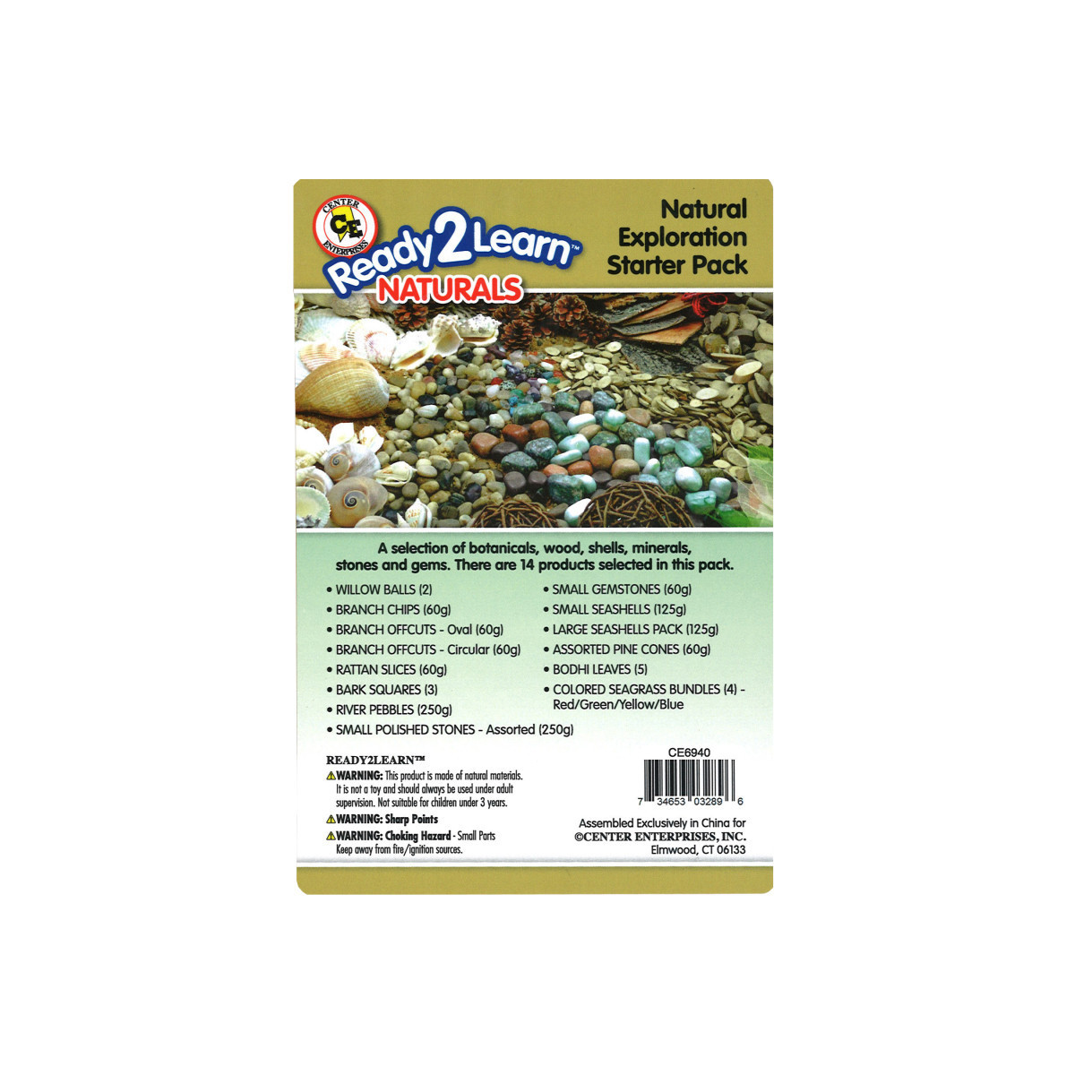 This selection includes 14 different types of natural materials: 2 willow balls, 60g branch chips, 60g ovular branch offcuts, 60g circular branch offcuts, 60g rattan slices, 3 bark squares, 250g river pebbles, 250g small polished stones, 60g small gemstones, 125g small seashells, 125g large seashells, 60g assorted pine cones, 5 bodhi leaves and 4 colored (red, green, yellow and blue) seagrass bundles. Exploration Naturals have limitless decorating and crafting possibilities! Children will enjoy the tactile stimulation of these natural materials. Add Exploration Naturals to sand play, sensory stations and loose parts kits. For ages 3+.