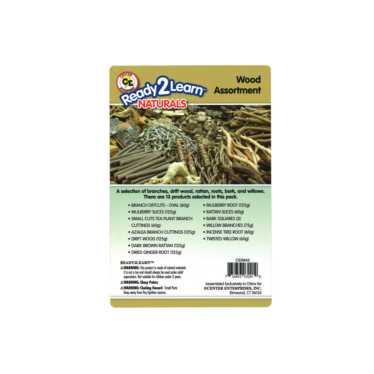 This selection of branches, drift wood, rattan, roots, bark, and willows enables children to explore, discuss and discover the natural outdoor environment. Each pack includes 13 products: Branch Offcuts-Oval (60g), Mulberry Slices (125g), Small Cuts Tea Plant Branch Cuttings (60g), Azalea Branch Cuttings (125g), Drift Wood (125g), Dark Brown Rattan (125g), Dried Ginger Root (125g), Mulberry Root (125g), Rattan Slices (60g), Bark Squares (3), Willow Branches (75g), Incense Tree Root (60g), and Twisted Willow (60g).
