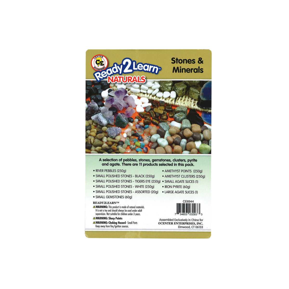 This selection includes 11 different types of stones and minerals: 250g river pebbles, 250g black small polished stones, 250g Tiger's Eye small polished stones, 250g white small polished stones, 250g assorted small polished stones, 60g small gemstones, 250g amethyst points, 250g amethyst clusters, 1 small agate slice, 60g iron pyrite and 1 large agate slice. They have limitless decorating and crafting possibilities! Children will also enjoy the visual and tactile stimulation of stone and mineral naturals. Add Stone and Mineral Naturals to sand and water play, sensory stations and loose parts kits. For ages 3+.