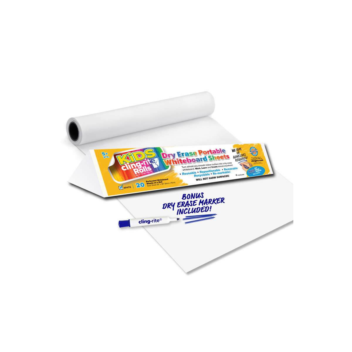 20 white dry erase sheets on a 50 foot roll. Each perforated Cling-rite® Roll sheet is 20 x 30 inches. Cling dry erase sheets to most indoor smooth surfaces. They are repositionable, erasable, recyclable and remarkable. Reuse with dry erase or low odor markers, or use other markers or acrylic paint for single use. Will not harm surfaces. Cling lightweight paper onto the surface for storyboarding, or under it for tracing images, no tape or adhesive required. Perfect for the home office, distance learning, home school, and art projects. Cling-rite® is safe and easy to use. Cling-rite® sheets are reusable and very easy to move from one location to another. No adhesives, will not leave residue.