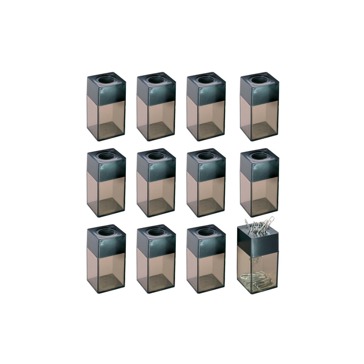 Plastic dispenser is easy to fill and simple to use. Magnetic top keeps clips handy, and prevents spilling. Pack of 12 dispensers.