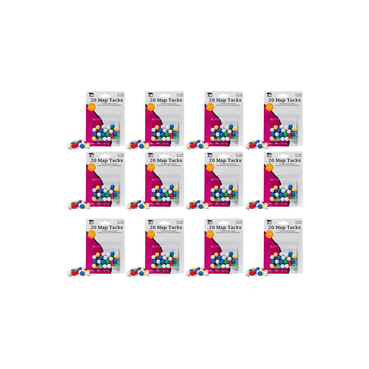Map tacks feature 3/8" solid plastic heads with rust resistant steel pins. Ideal for pin pointing map locations. Each pack includes 20 tacks in assorted colors. Sold as 12 packs for a total of 240 tacks.