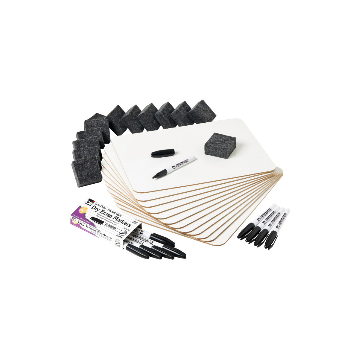 This class pack includes 12 plain one-sided masonite lap boards that measure 9" x 12". Also included is a box of 12 pocket-style dry erase markers with bullet tips in black and a 12 pack of 2" multi-purpose erasers. An environment friendly way to learn, as you just write, wipe off and re-use with no waste. Markers are AP Certified, Conform to ASTM D-4236.