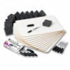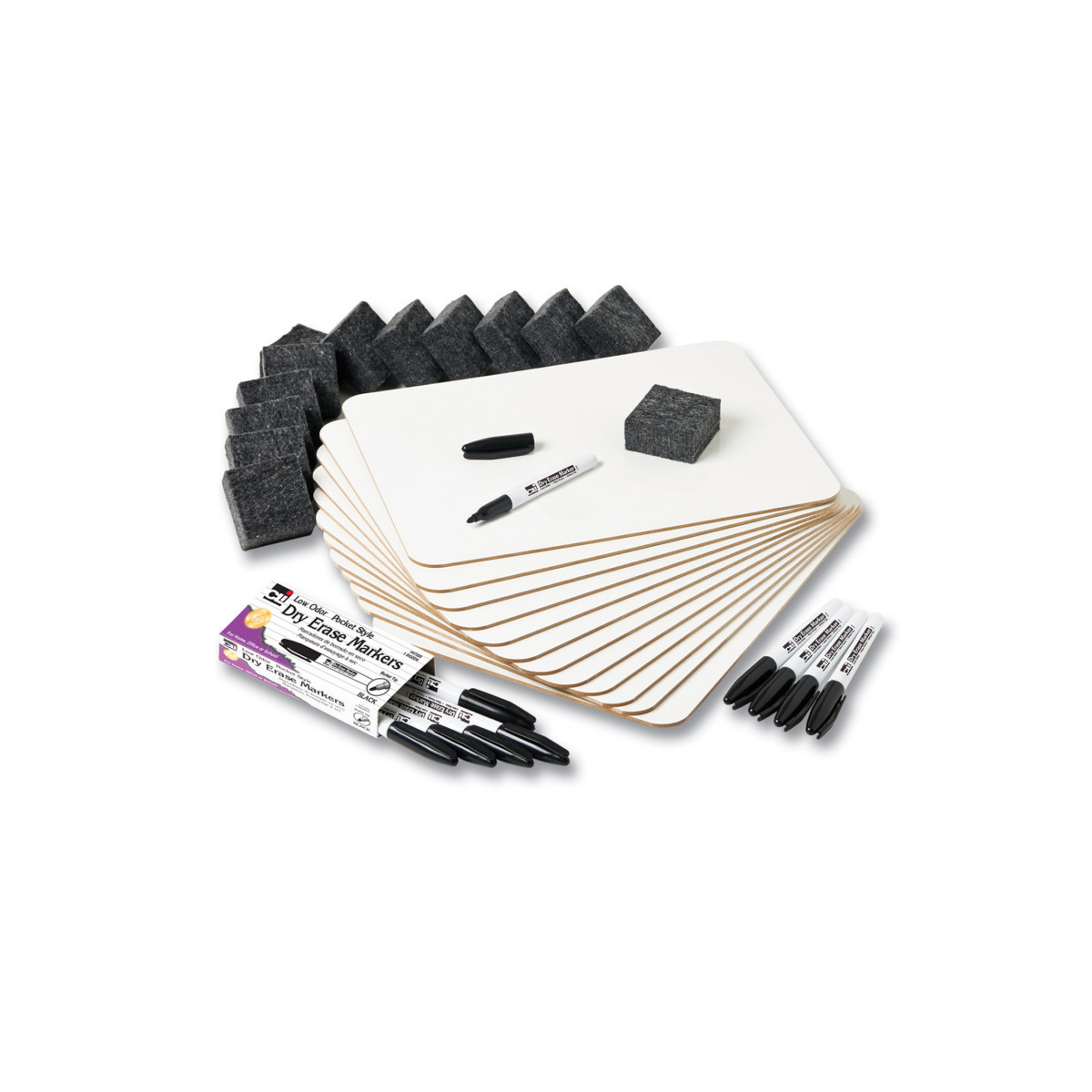 This class pack includes 12 durable magnetic masonite lap boards that are dual sided, plain white on both sides, and measure 9" x 12". Also included is a box of 12 pocket-style dry erase markers with bullet tips in black and a 12 pack of 2" multi-purpose erasers. An environment friendly way to learn, as you just write, wipe off and re-use with no waste. Markers are AP Certified, Conform to ASTM D-4236.