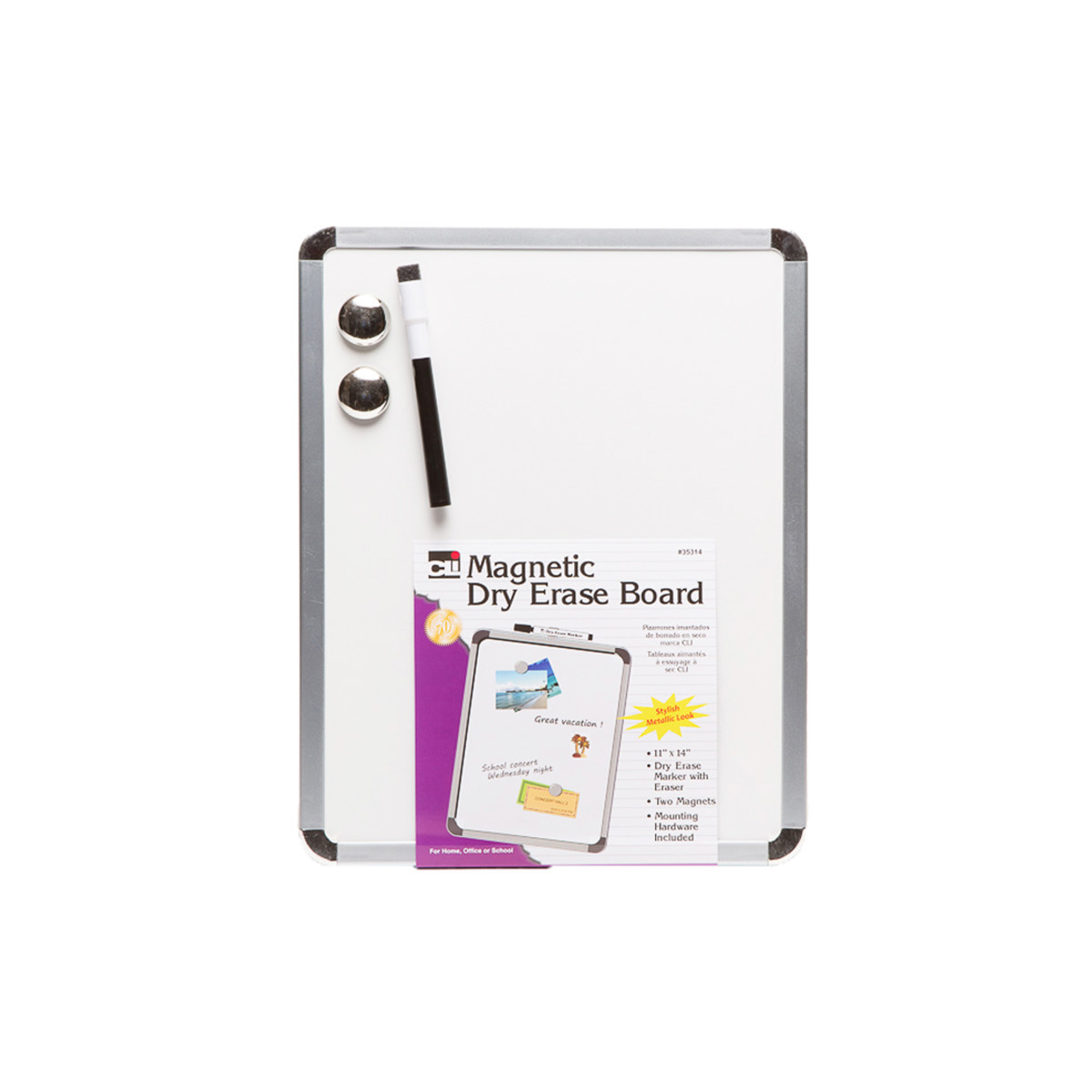 Magnetic dry erase board comes in a stylish and contemporary silver frame, which can easily match the decor in your home, dorm, classroom or office. Mounting hardware allows you to either secure the board permanently by using just the adhesive pads or use the magnetic strips for a transportable board. Comes with a dry-erase marker with eraser and two silver magnets which allows the dry erase board to also double as a bulletin board for all your notes, pictures or anything else you might need. Marker is non-toxic and conforms to ASTM D4236.