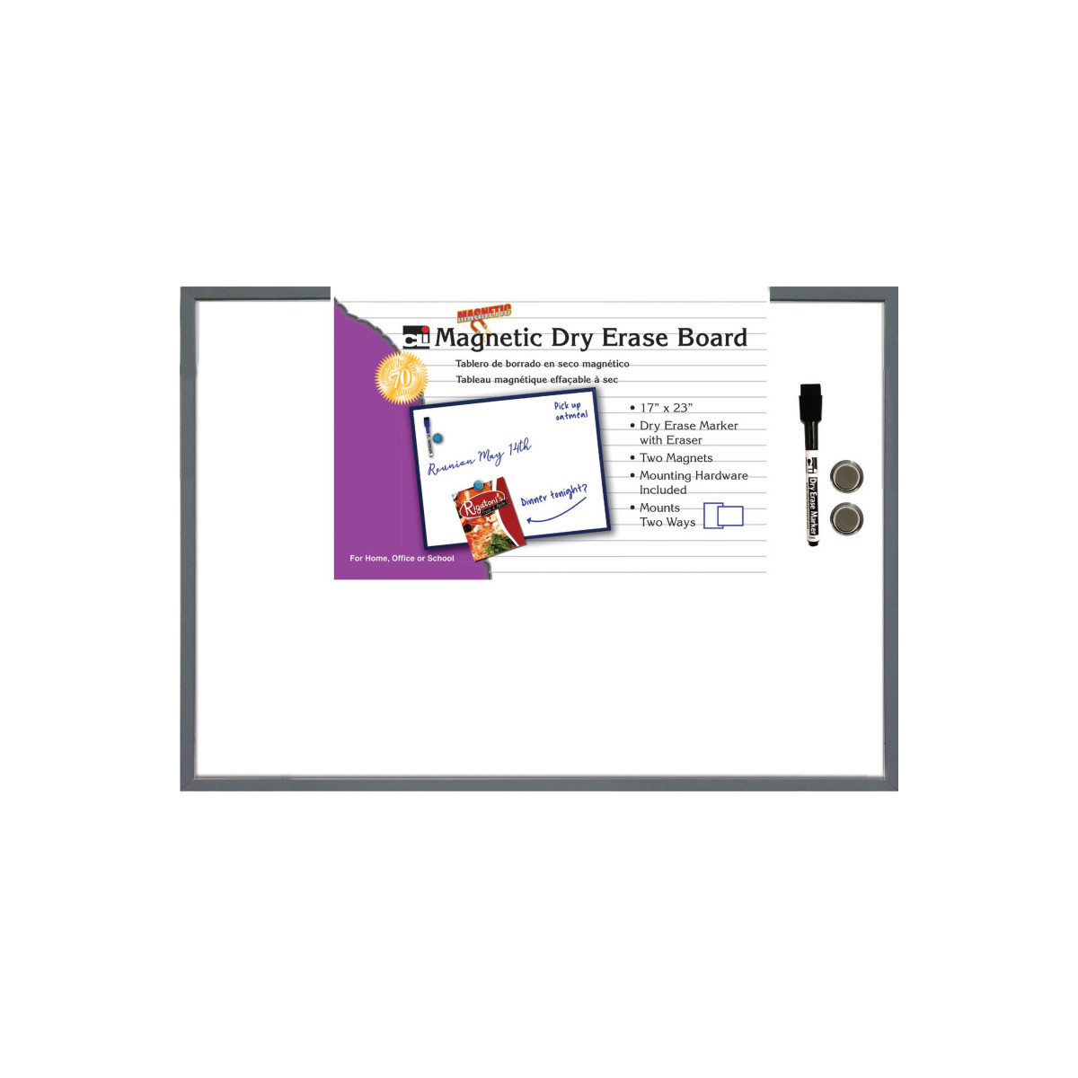 Magnetic dry erase board comes with a gray frame can easily match the decor in your home, dorm, classroom or office. Board measures 23" wide by 17" high, giving you a large writing area. Mounting hardware allows you to secure the board permanently and securely by using just the adhesive pads. Comes with a dry-erase marker with eraser and two magnets which allows our dry erase board to also double as a bulletin board for all your notes, pictures or anything else you might need. Marker is non-toxic and conforms to ASTM D4236.