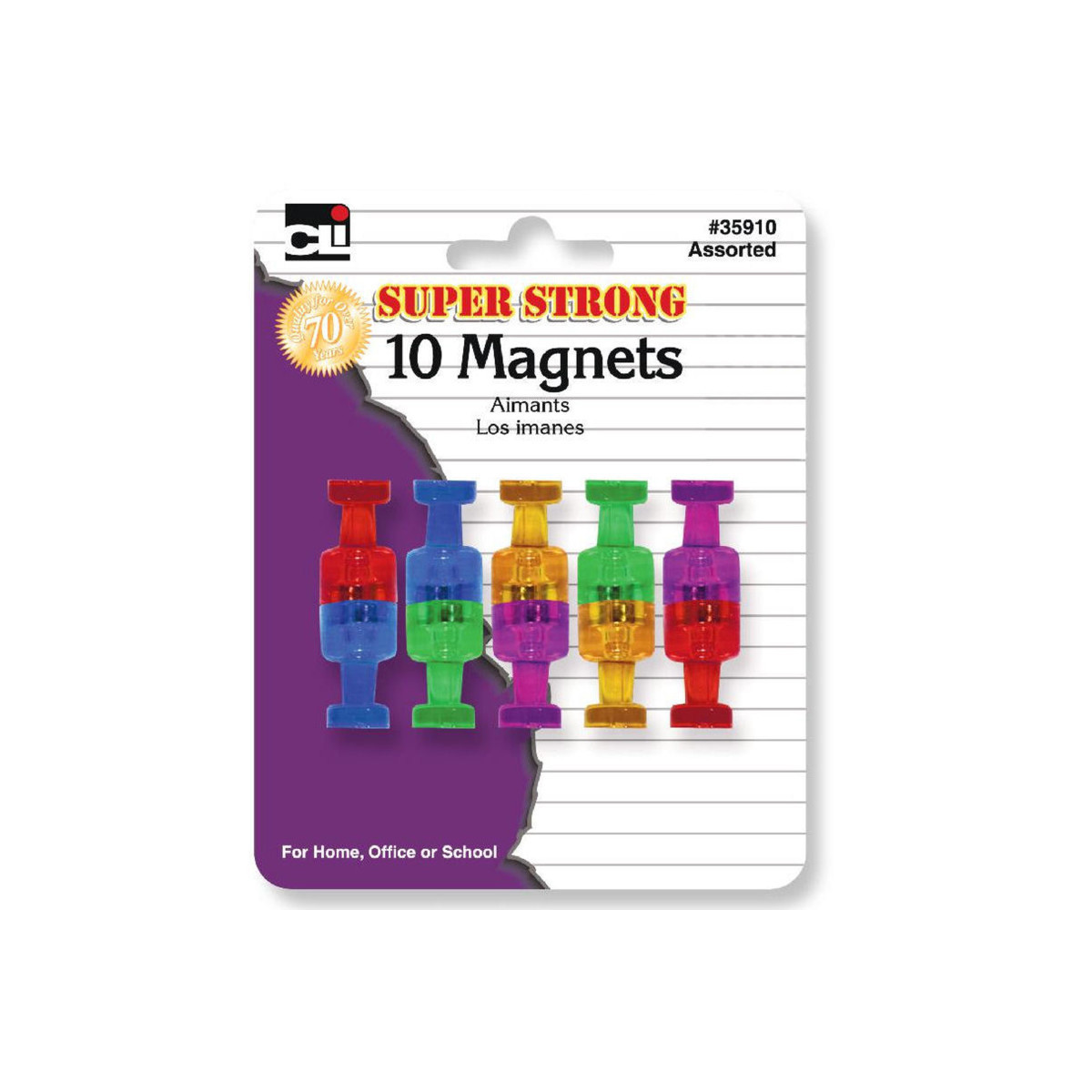 These stylish and colorful strong magnets work well on all magnetic surfaces. From filing cabinets, magnetic whiteboards to most metal surfaces. Powerful magnets hold securely. Assorted translucent colors allows for extra organization. Stylish and colorful, these strong magnets will hold up all your paperwork! Stylish Push Pin magnets are as strong as they are colorful. Includes 10 per pack in blue, green, red, purple, and gold.