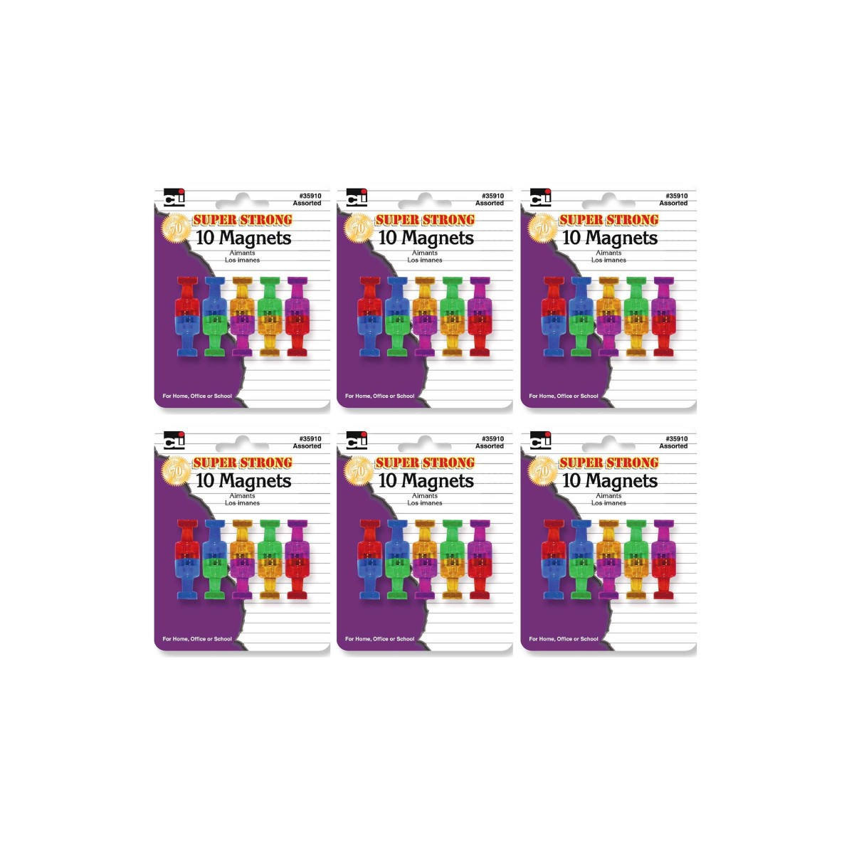 These stylish and colorful strong magnets work well on all magnetic surfaces. From filing cabinets, magnetic whiteboards to most metal surfaces. Powerful magnets hold securely. Assorted translucent colors allows for extra organization. Stylish and colorful, these strong magnets will hold up all your paperwork! Stylish Push Pin magnets are as strong as they are colorful. Includes 10 per pack in blue, green, red, purple, and gold. Sold as 6 packs for a total of 60 magnets.