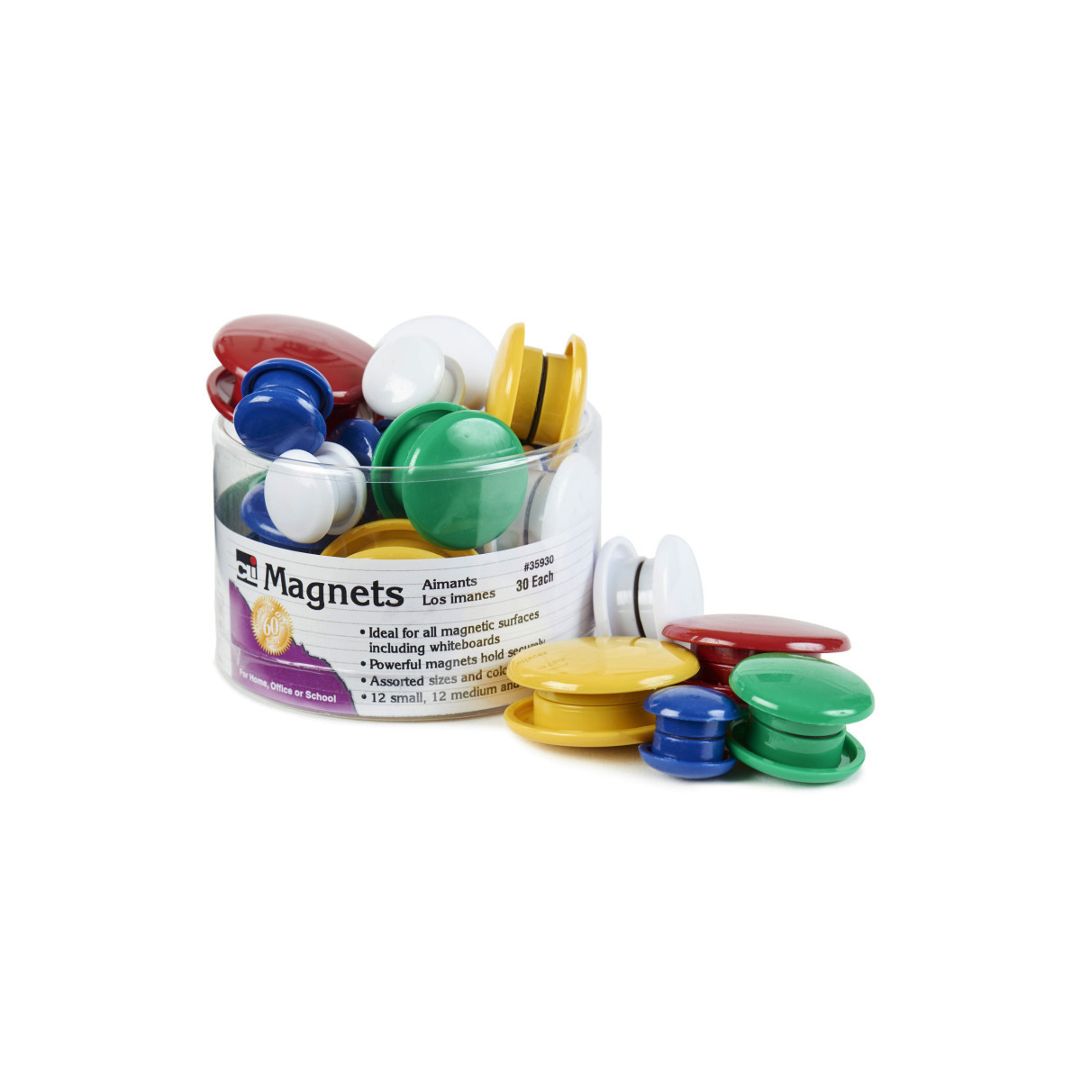 These colorful, strong magnets work well on all magnetic surfaces. From filing cabinets, magnetic whiteboards to most metal surfaces. Powerful magnets hold securely. Assorted colors and sizes for extra organization. Tub includes 12 small, 12 medium and 6 large magnets. Assorted colors include: blue, green, red, white and yellow.