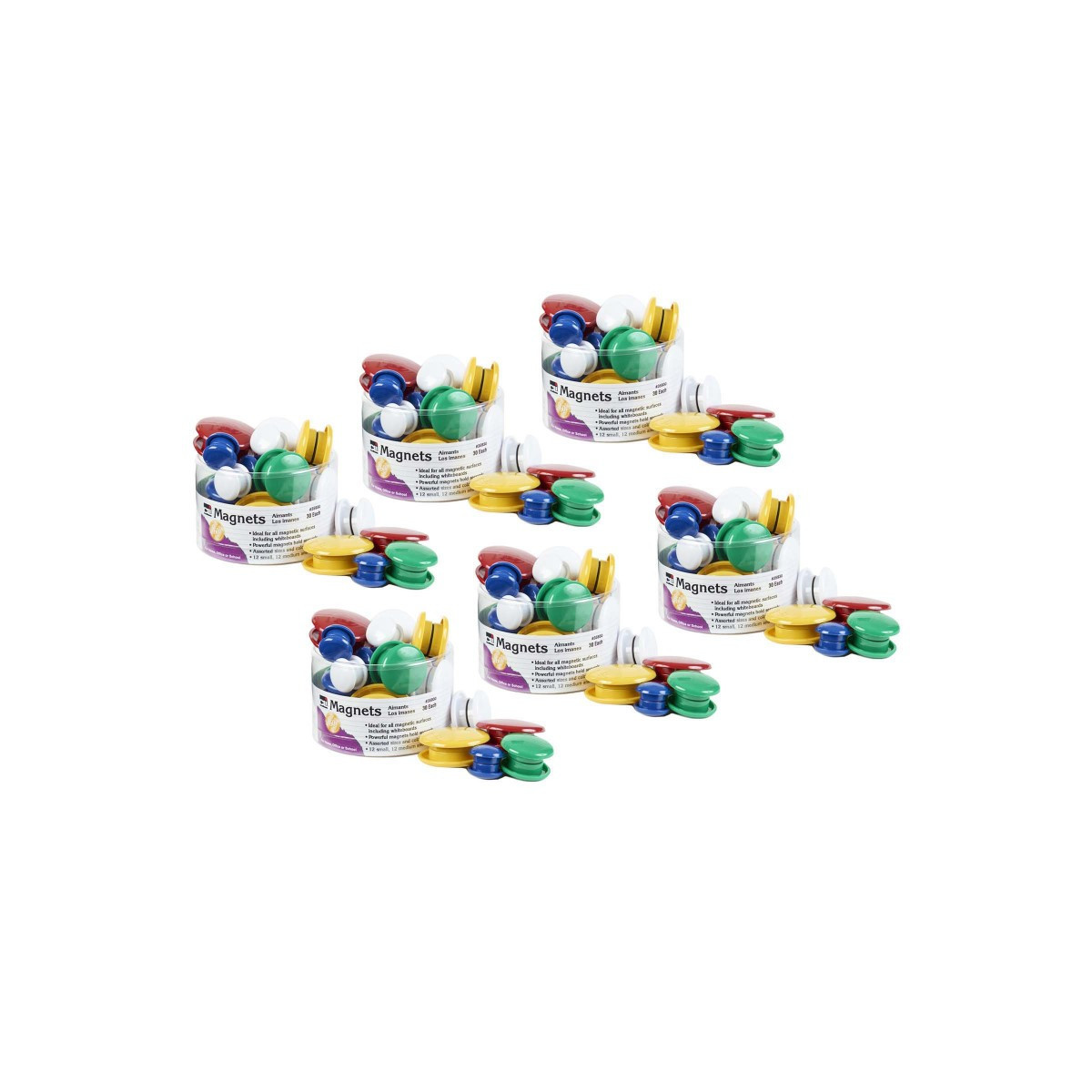 These colorful, strong magnets work well on all magnetic surfaces. From filing cabinets, magnetic whiteboards to most metal surfaces. Powerful magnets hold securely. Assorted colors and sizes for extra organization. Each tub includes 12 small, 12 medium and 6 large magnets. Assorted colors include: blue, green, red, white and yellow. Sold as 6 packs for a total of 180 magnets.