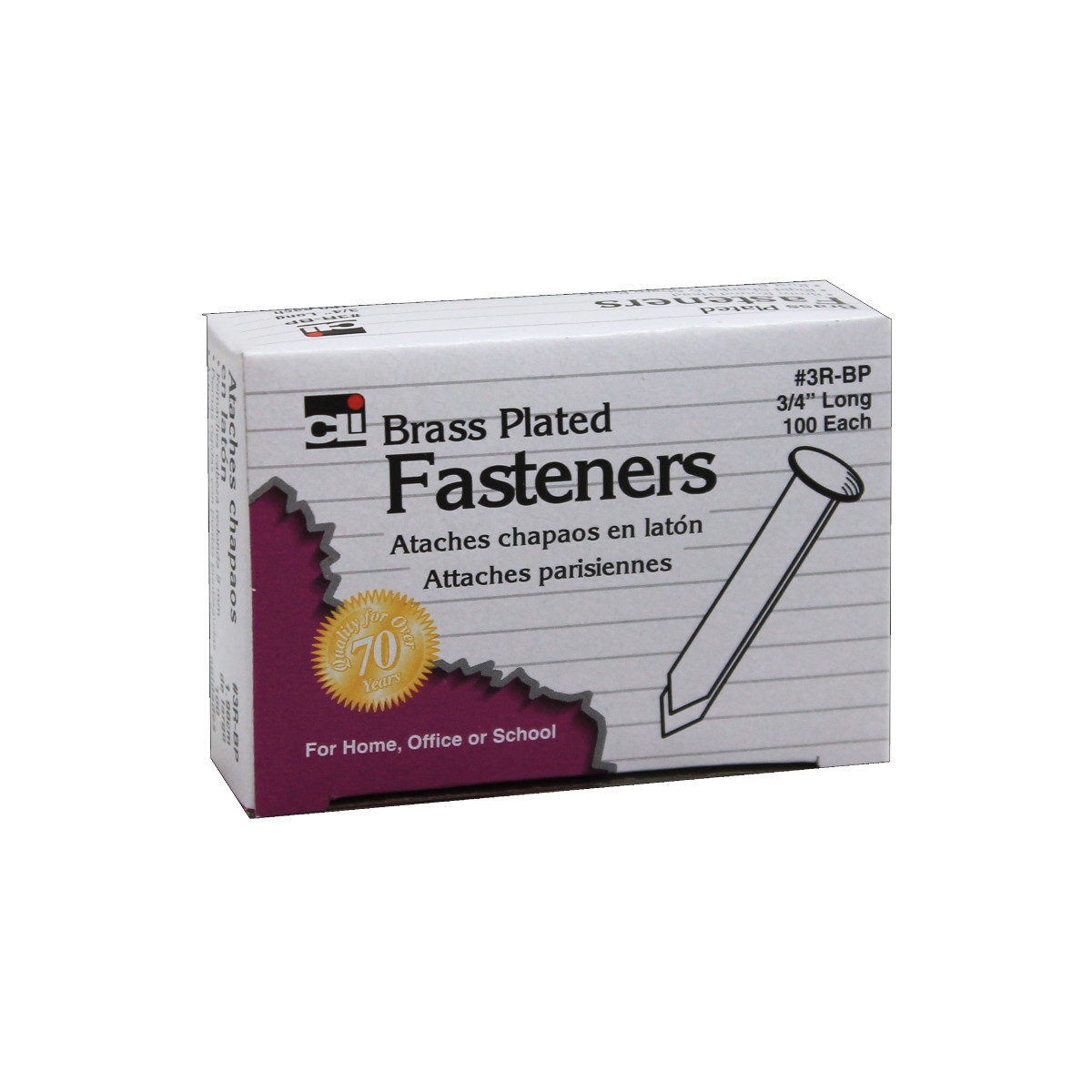 Bright, brass plated finish. Rigid shanks and sharp points for easy penetration. Wide heads prevent fasteners from pulling through punched holes. 3/4" shank, 8mm head. Each pack includes 100 fasteners.