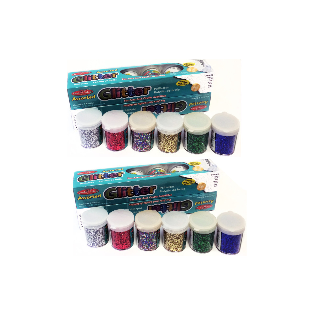 Brighten up any arts and craft project with these shimmering glitter flakes. Easy to use: Spread adhesive on any surface and then sprinkle glitter from our convenient shaker container. Each set includes 2 each of 6 different colors. Sold as 2 sets for a total of 24 containers of glitter.