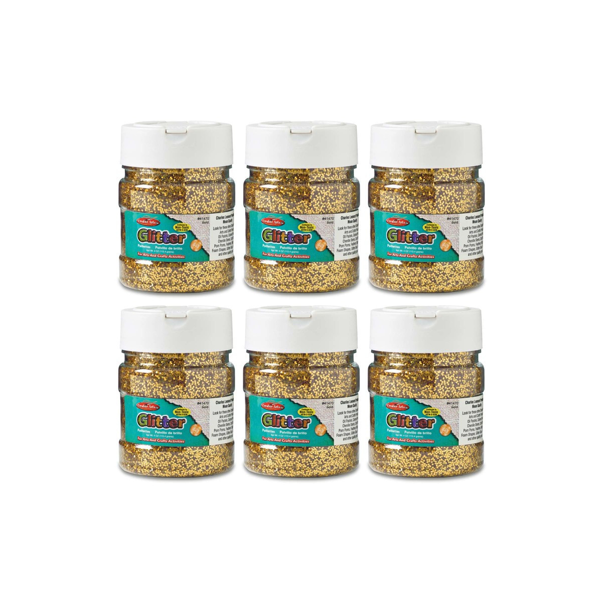 Brighten up any arts and craft project with these shimmering glitter flakes. Easy to use: Spread adhesive on any surface and then sprinkle glitter from our convenient shaker container. Each jar contains 4 oz. of glitter. Pack of 6 jars.
