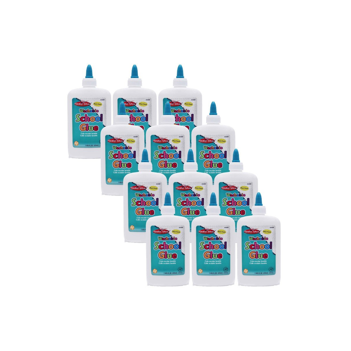 Washable school glue bonds to most porous surfaces like paper and cloth, as well as semi-porous surfaces such as wood and ceramics. Washes out with soap and water. Ideal for school and crafts projects. AP Certified, non-toxic. Conforms to ASTM D-4239. Pack of 12 glue bottles.