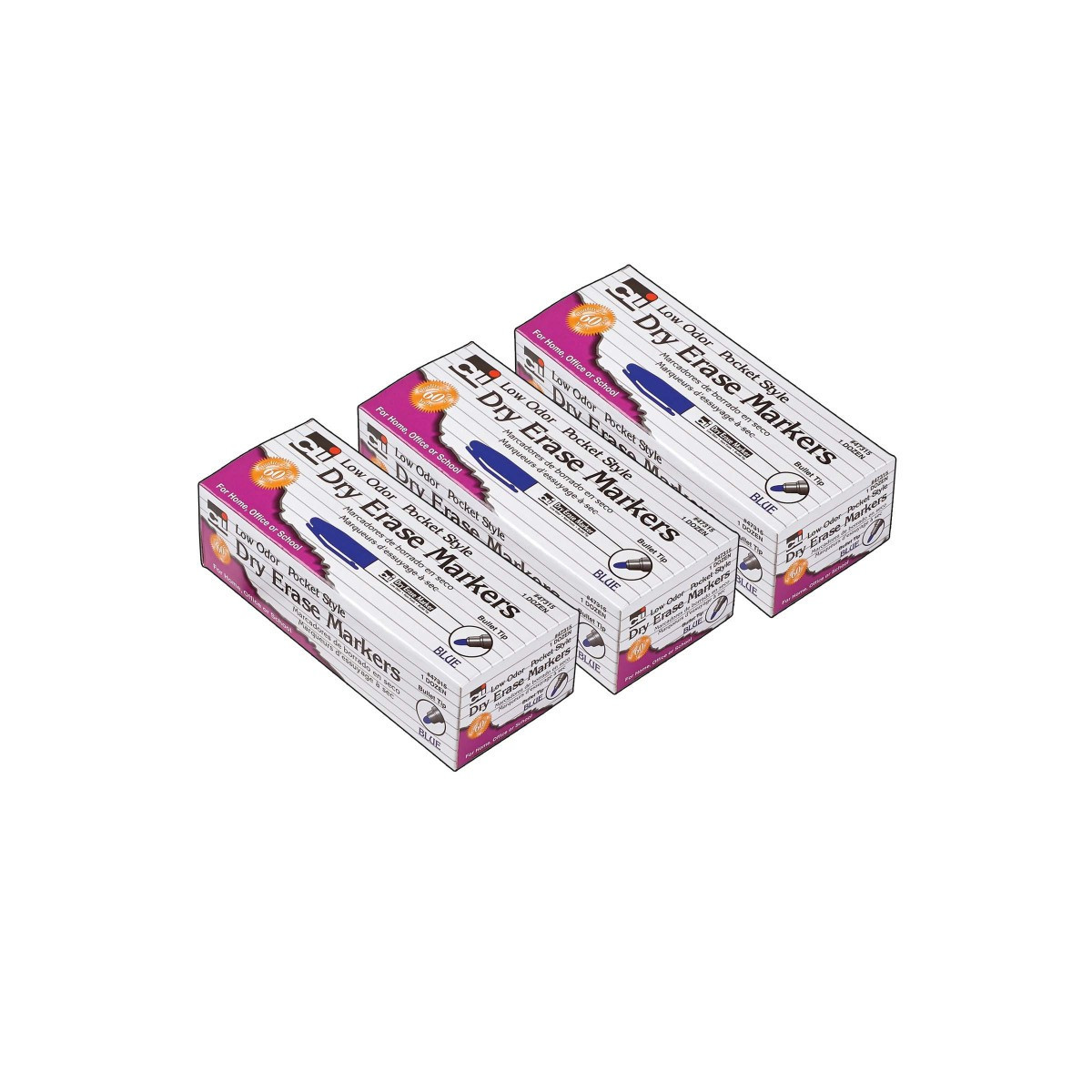 These dry erase markers are low odor but feature bold, bright vivid colors. Making sure that all your work can be seen, whether you are at the back of the class or boardroom! These dry erase markers can be used on dry erase boards, glass or any other dry erase surface. Markings will wipe away cleanly and easily using either a dry erase eraser or cloth. These pocket style markers have bullet tips and are AP Certified, NON-Toxic, conforming to all ASTM D-4236 standards. Each pack includes 12 markers. Sold as 3 packs for a total of 36 markers.