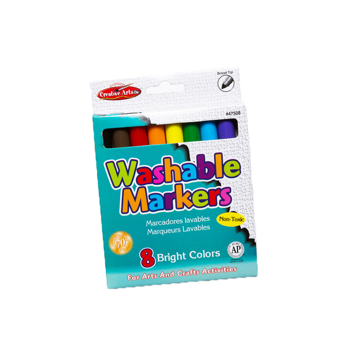 These washable markers feature bright, colorful and long lasting colors that make all artwork and projects look even better. Washable from skin and most clothes. Larger barrels are easier for small hands and broad tips. Non-Toxic conforms to ASTM D-4236.