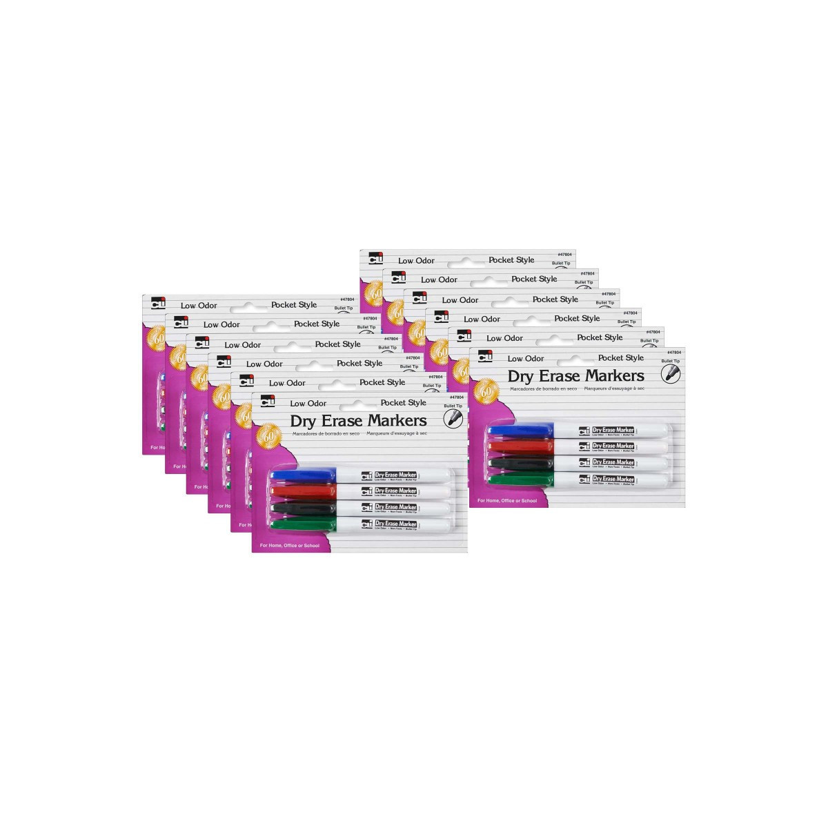 Pocket style dry erase markers feature low odor and bright vivid colors. Use on dry erase boards or glass. Markers wipe away clean and easily. Features a bullet tip and is non-toxic. AP Certified, conforms to ASTM D-4236. Each pack includes 4 markers in 4 colors. Sold as 12 packs for a total of 48 markers.