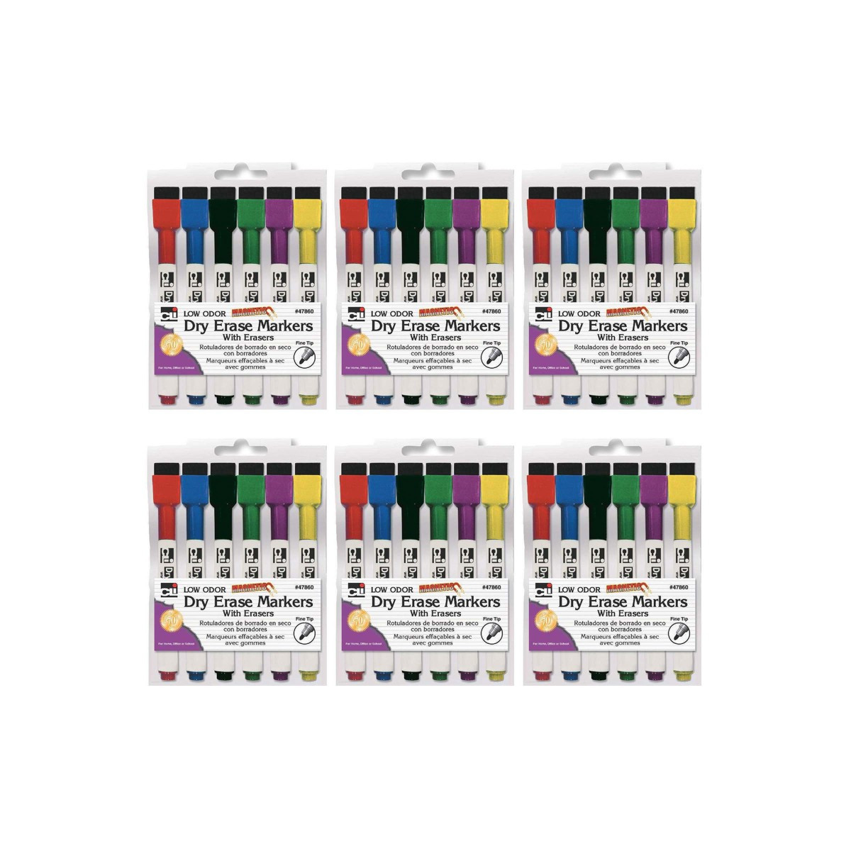 Fine point dry erase markers feature a magnetic cap with eraser. Easily store your marker on any magnetic surface. Use these markers on all dry erase boards or glass. Markers also feature bright vivid colors and are low odor. Non-toxic, AP Certified, conforms to ASTM D-4239. Each pack includes 6 markers. Sold as 6 packs for a total of 36 markers.
