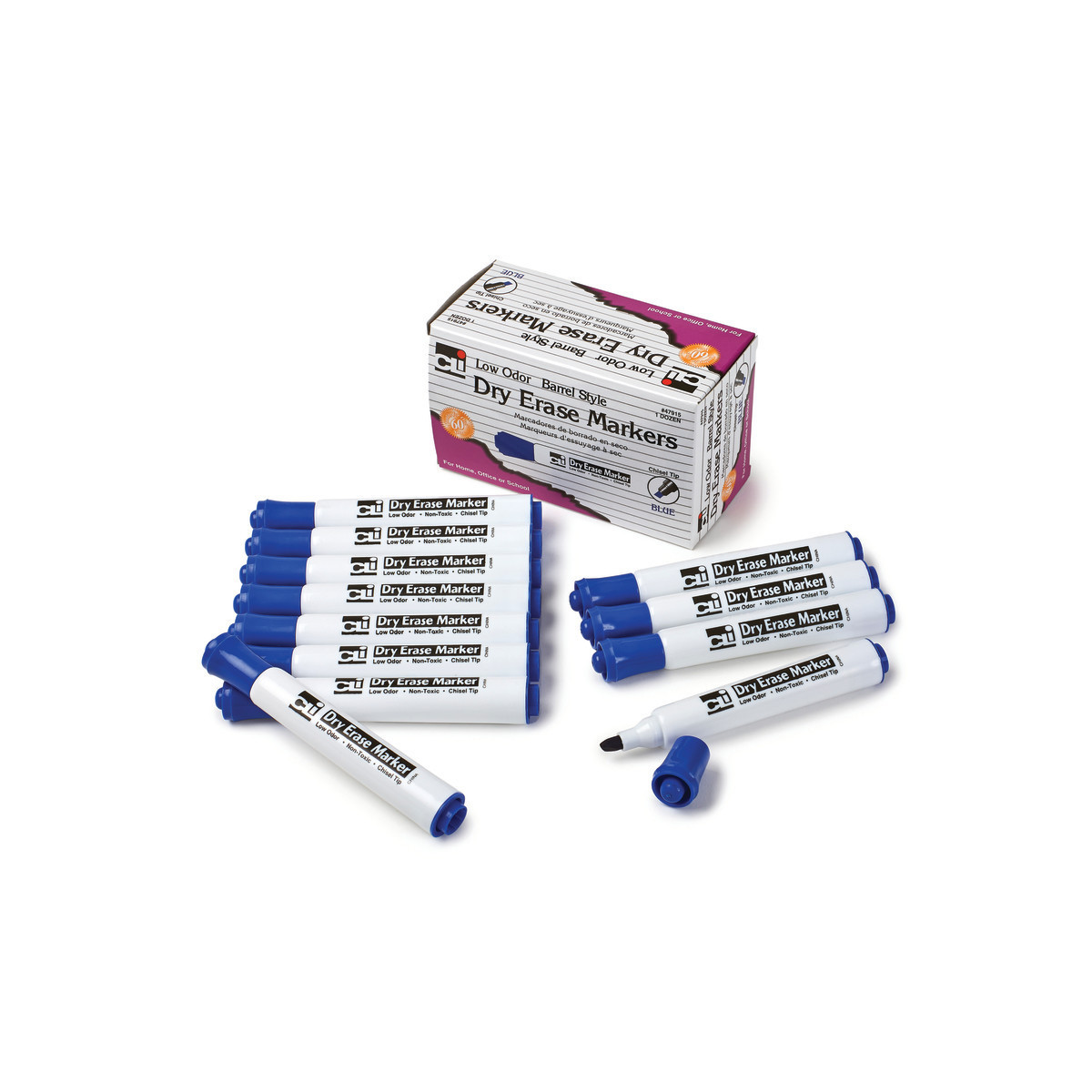 These dry erase markers are low odor but feature bold, bright vivid colors. Making sure that all your work can be seen, whether you are at the back of the class or boardroom! These dry erase markers can be used on dry erase boards, glass or any other dry erase surface. Markings will wipe away cleanly and easily using either a dry erase eraser or cloth. These barrel style markers have chisel tips and are AP Certified, NON-Toxic, conforming to all ASTM D-4236 standards. Box contains 12 blue dry erase markers.