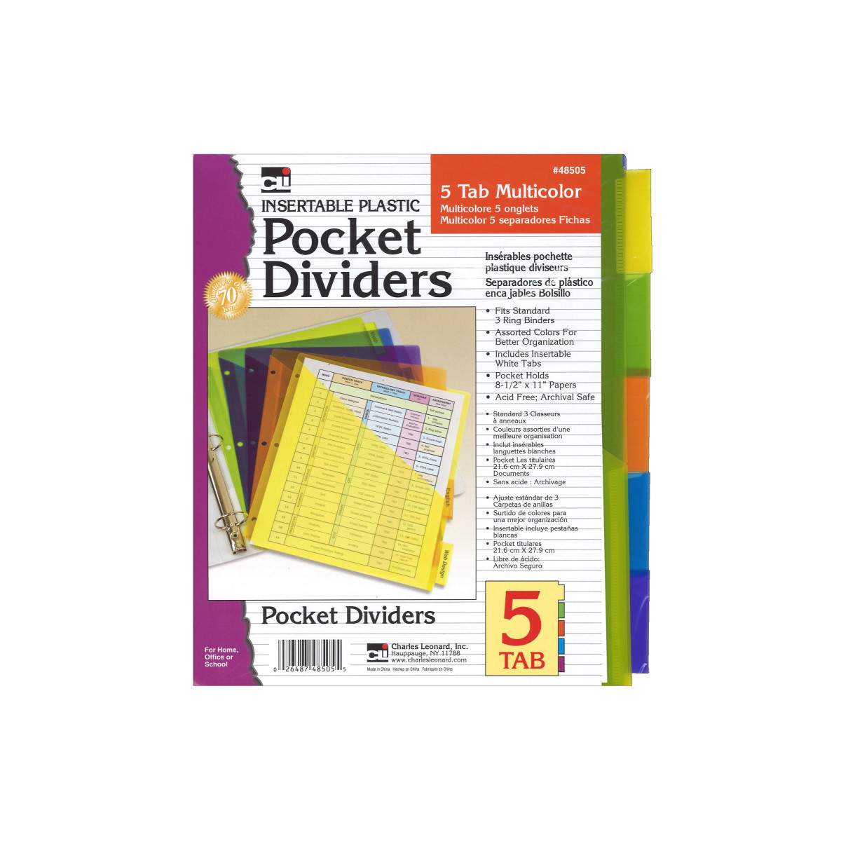 Fits most standard 3 ring binders, multi-color customizable tabs included. 5 tab positions and pockets for easy organizing.