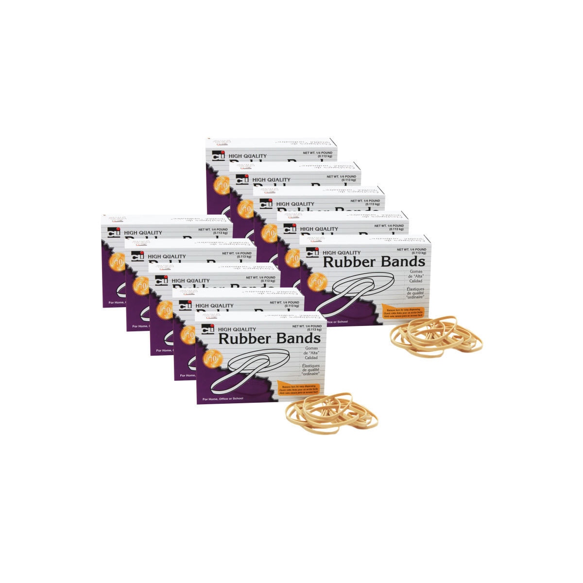 High quality bands made from 100% pure rubber. Seamless construction offers greater tensile strength, and durability. Each box includes 1/4 pound of rubber bands. Sold as a pack of 10 boxes of rubber bands.