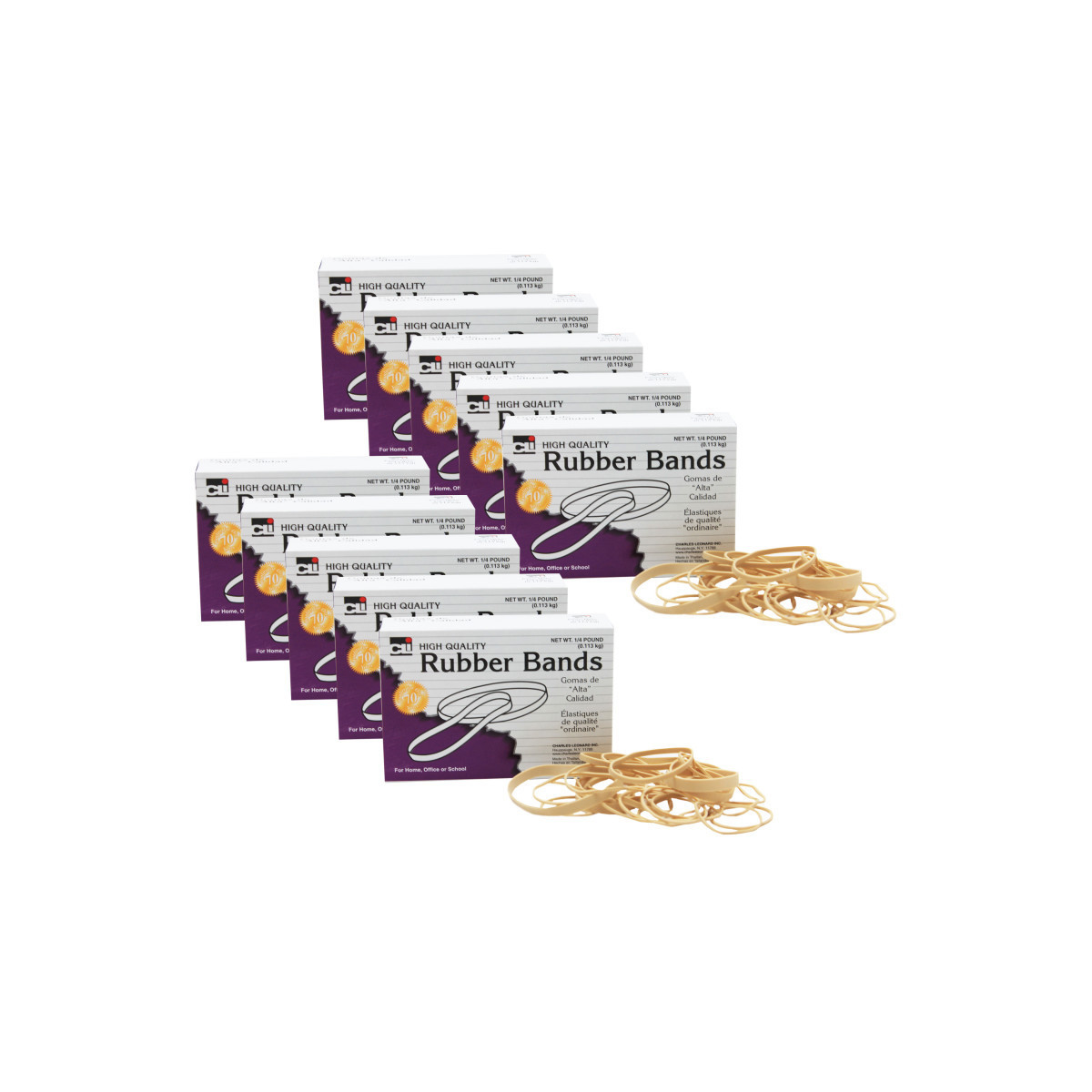 High quality bands made from 100% pure rubber. Seamless construction offers greater tensile strength, and durability. Each box includes 1/4 pound of rubber bands. Sold as a pack of 10 boxes of rubber bands.