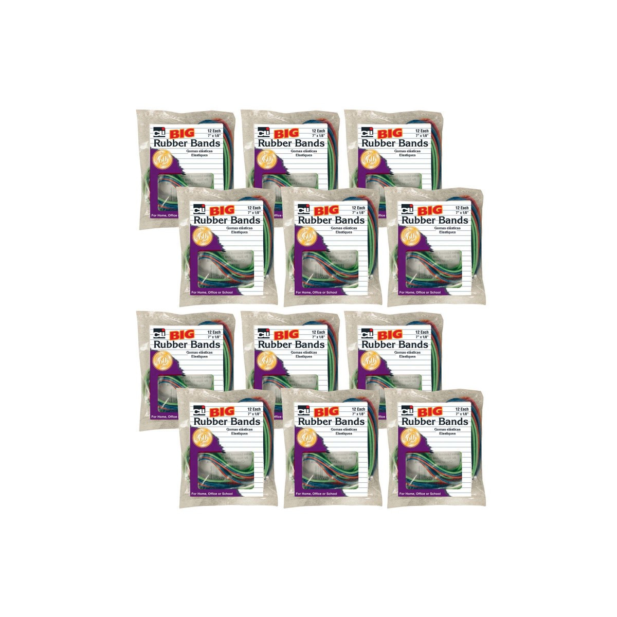High quality bands made from 100% pure rubber. Seamless construction offers greater tensile strength, and durability. Great Quality at a great price. Assorted colors. 12 pack. Sold as set of 12 packs, 144 rubber bands total.