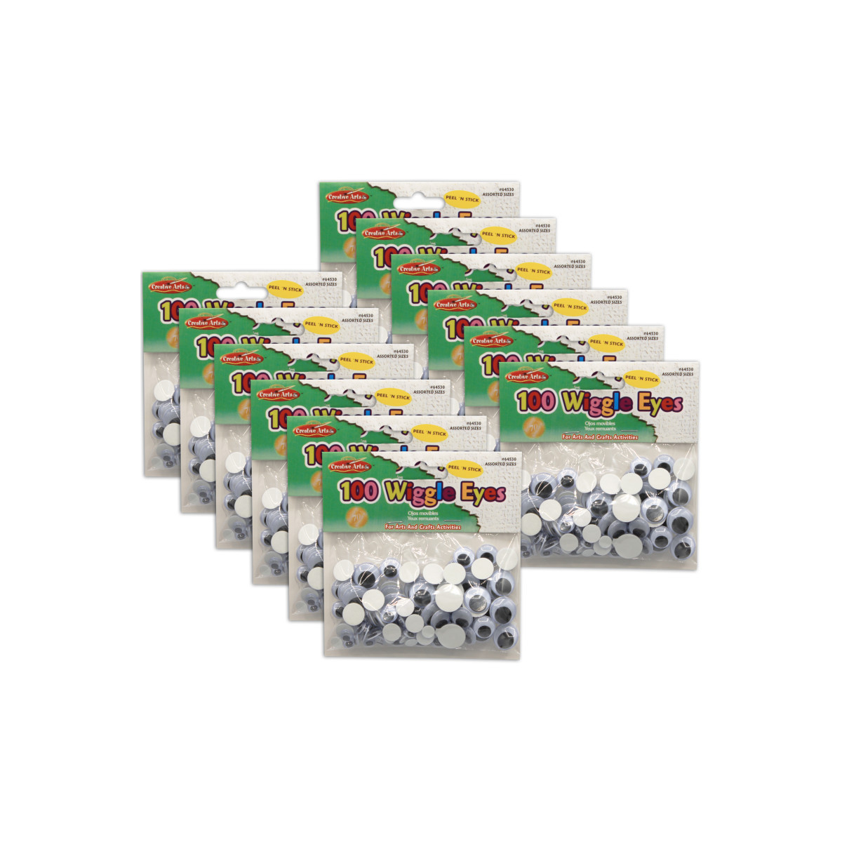 Give your projects "Eye" catching appeal. Wiggle eyes bring life to dolls, animals, toys and more! Available in a peel 'n stick self-adhesive. Great for any Arts and Craft Project. Each pack includes 100 wiggle eyes. Sold as 12 packs for a total of 1200 wiggle eyes.