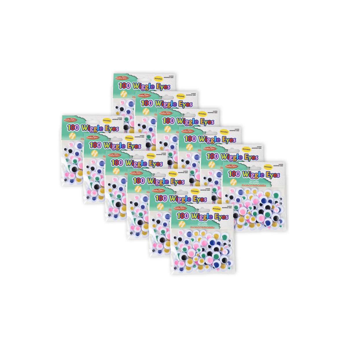 Give your projects "Eye" catching appeal. Wiggle eyes bring life to dolls, animals, toys and more! Features a flat back for gluing. Great for any Arts and Craft Project. Sizes include 28MM, 30MM, 35MM and 40MM. Each pack includes 100 wiggle eyes. Sold as 12 packs for a total of 1200 wiggle eyes.