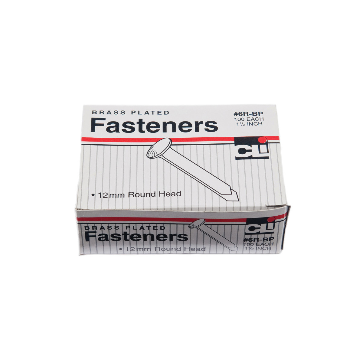 Bright, brass plated finish. Rigid shanks and sharp points for easy penetration. Wide heads prevent fasteners from pulling through punched holes. 1-1/2" shank, 12mm head. Each box includes 100 fasteners.