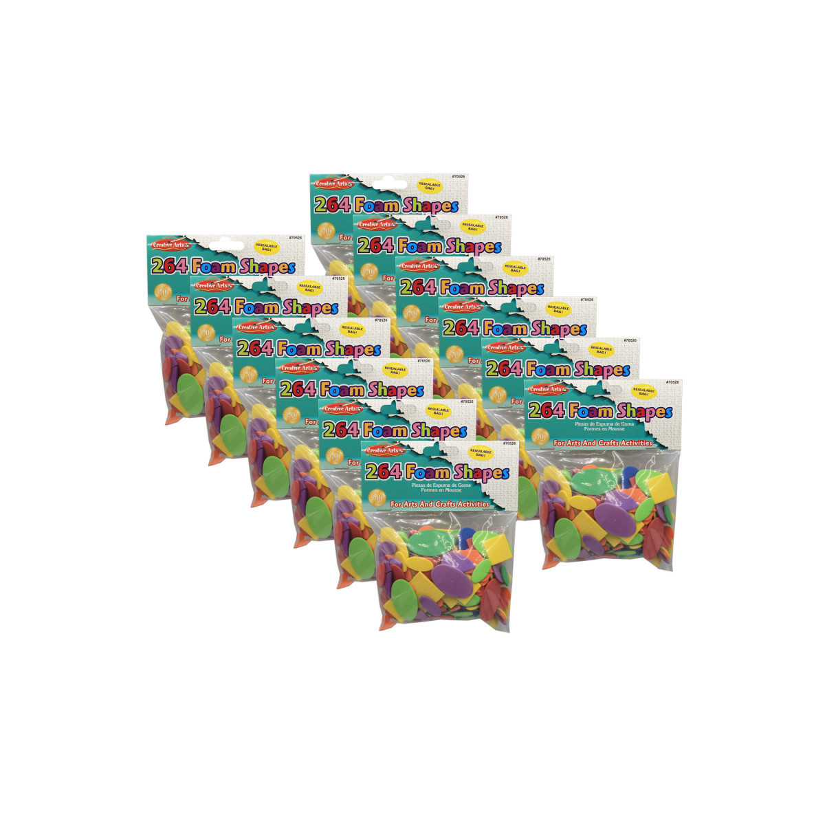 Create colorful works of art. Assorted sizes, colors and shapes make all arts and craft project fun. Packed in convenient resealable plastic bag. Each pack includes 264 foam shapes. Sold as 12 packs for a total of 3168 shapes.
