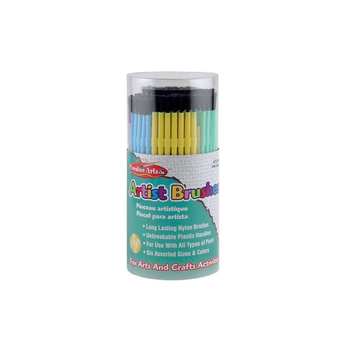 Artist brushes with colorful handles are made of long-lasting nylon bristles and durable handles. Handles are made of flexible plastic. Use with all types of paint. This set includes 144 artist brushes in assorted sizes and colors. These brushes are perfect for arts and crafts.