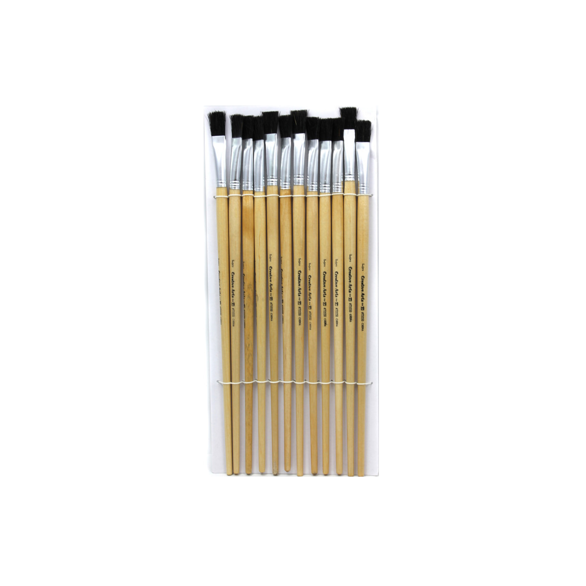 Fine grade natural black bristles. Seamless polished aluminum ferrules are double crimped to handles. Natural hardwood handles feature lacquered finish. Each pack includes 12 brushes with flat, 1/2" wide bristles and a long handle.