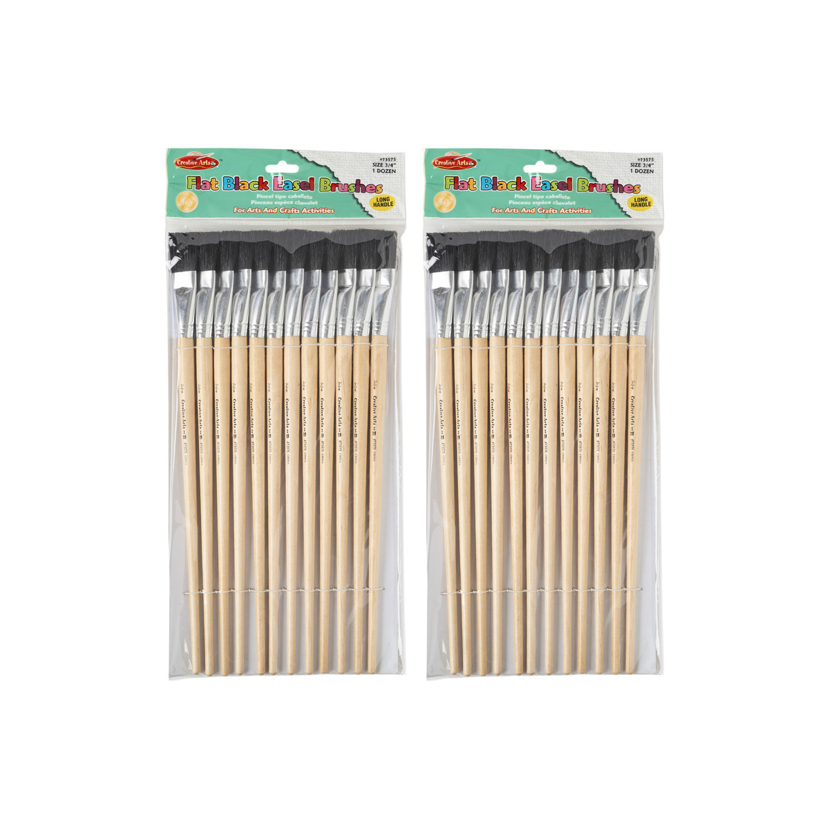 The flat easel paint brush is perfect for arts and crafts. The brush has black bristles, and is 3/4 inch wide. Each pack includes 12 brushes. Sold as 2 packs for a total of 24 brushes.